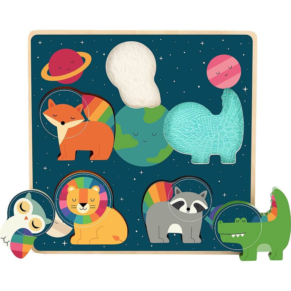 Sous chaque animal se cache une texture que l'enfant découvre en soulevant les pièces. Doux, granuleux, rugueux, avec des stries, les textures cachées sous les animaux procurent autant de sensations qui permettent aux petits dès 18 mois de développer plus finement le sens du toucher.