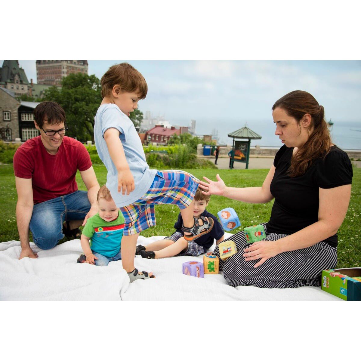 Prends un dé et amuse-toi à le lancer au bout de tes bras! Attention! Le dé t’indique une consigne à exécuter. Construis la tour un dé à la fois et fais-la tomber!