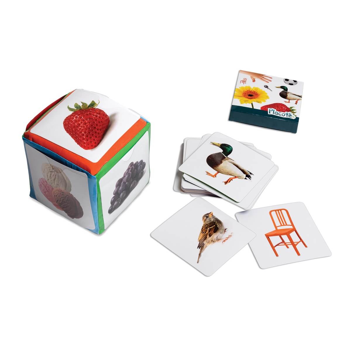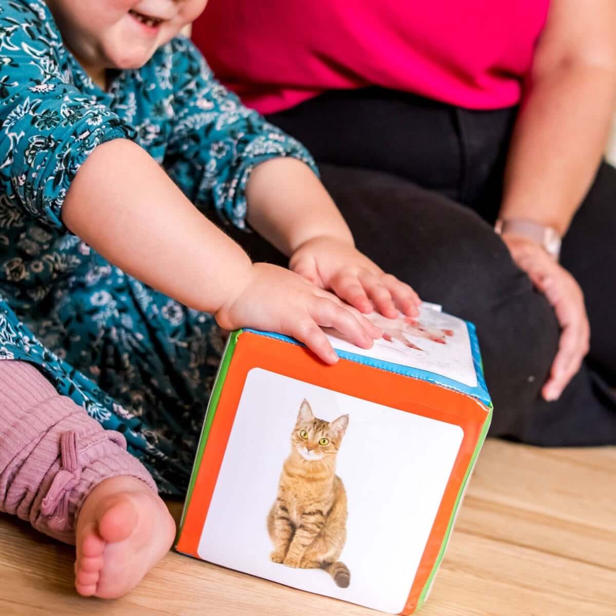 Le dé des premiers mots est conçu pour aider les enfants de 6 mois et plus à produire des sons, puis à dire des mots, vers 1 an. Les 60 photographies qui peuvent être insérées dans les pochettes du dé correspondent aux premiers noms appris par les tout-petits en général.