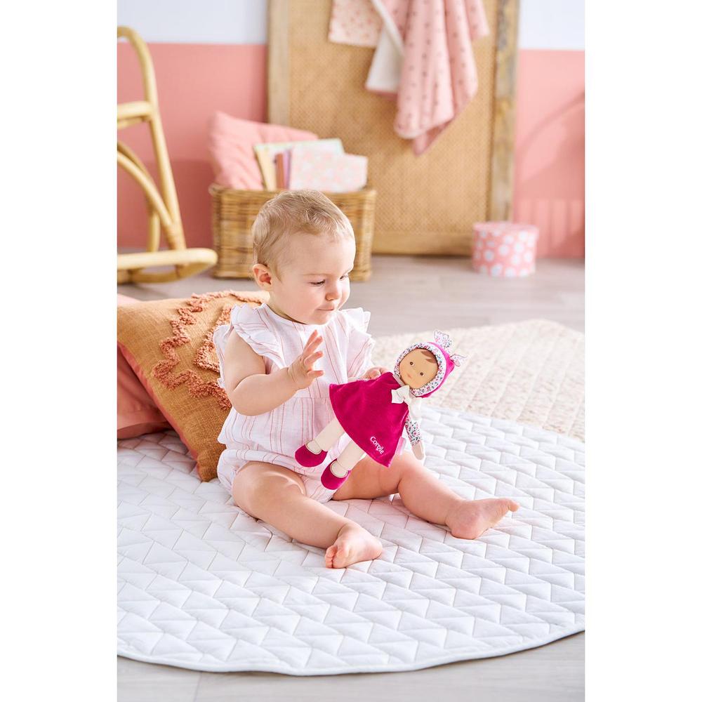 Parfaite pour accompagner bébé partout, Miss Rose Grenadine est la petite poupée qui ne sera jamais oubliée. Elle est parfaitement dimensionnée (25 cm de haut) pour que les petites mains puissent la saisir et la tenir par son bas, son chapeau, ses bras, ses jambes et même sa robe. Elle est faite d'un tissu ultra-doux qui la rend très câline. Son doux visage réaliste en vinyle charme et réconforte bébé et est délicatement parfumé à la vanille, une signature Corolle.