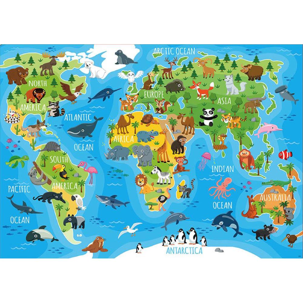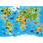 Casse-tête de 150 pièces représentant une carte du monde et des animaux emblématiques.