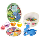 Le jeu comprend: Un plateau de jeu coloré en forme d'œuf (imprimé dans la boîte), une roulette de jeu, 16 carottes en plastique de quatre couleurs, quatre paniers en plastique, un pince-lapin Hoppy Floppy et des instructions multilingues