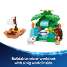 Doté d'un modèle double face inspiré du film Vaiana 2 de Disney, ce jeu de micro-monde à construire est un petit ensemble avec un grand monde à l'intérieur. L'île possède un toboggan en cascade avec une entrée cachée et la maison a des pièces pour les micro-poupées LEGO Disney de Vaiana et de sa petite sœur Simea, ainsi qu'un espace pour Pua. Il y a un petit bateau et des lanceurs d'histoires captivants et l'île peut être verrouillée avec la clé, ce qui la rend parfaite pour un jeu portable en déplacement.