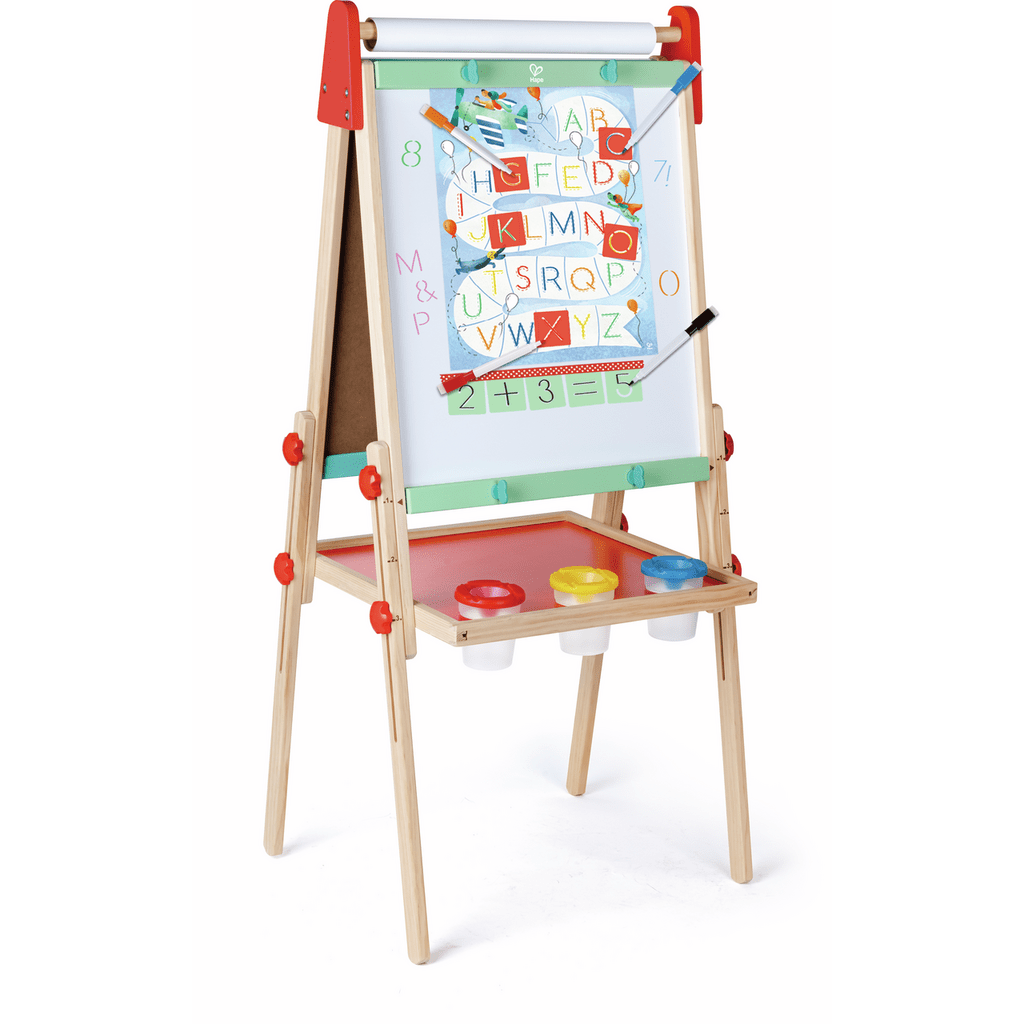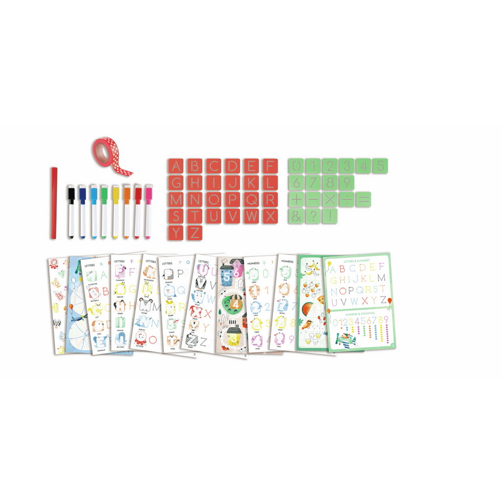 Comprend 44 pochoirs de lettres et de chiffres et un album avec 10 activités. Parfait pour une utilisation sur les chevalets Hape !