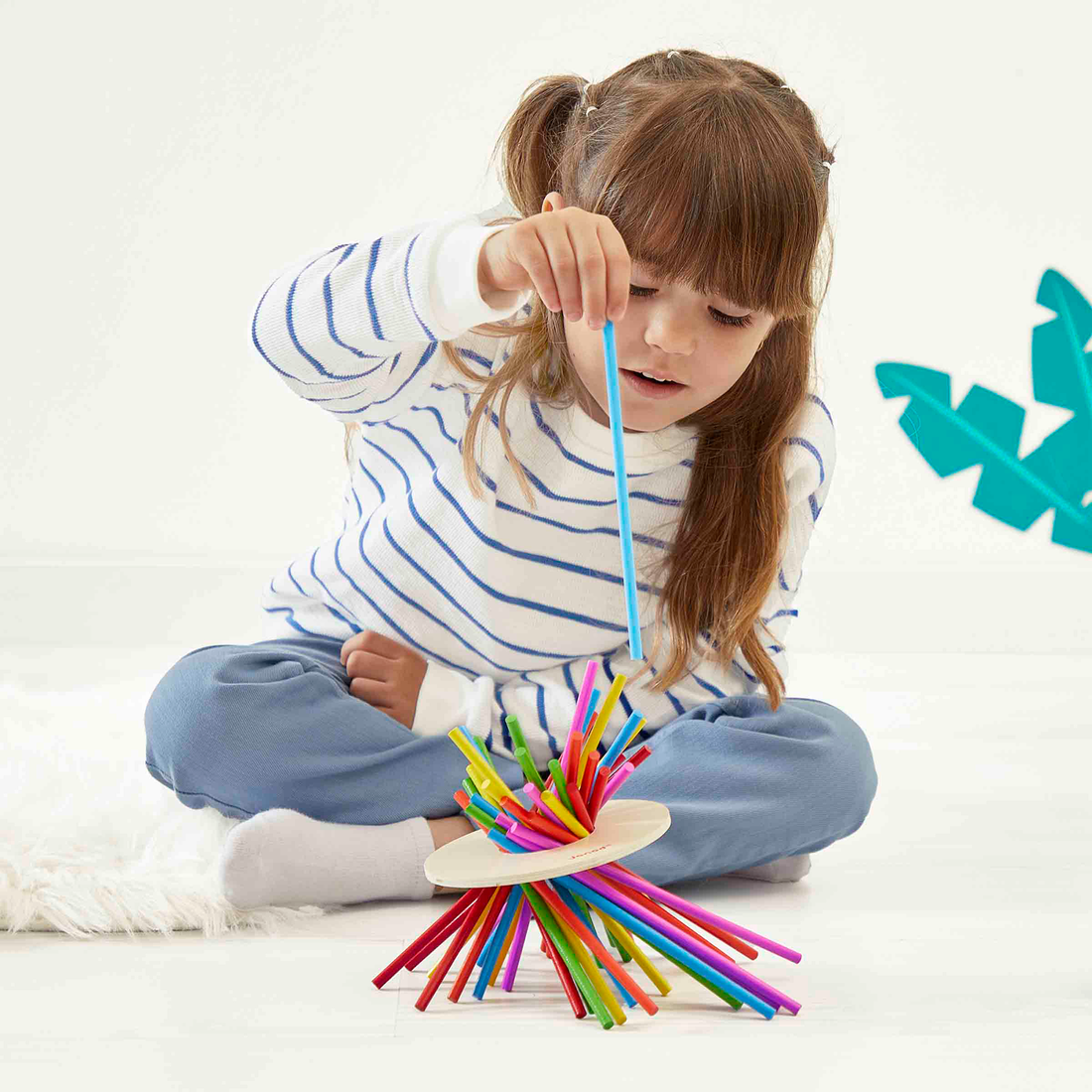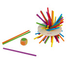 Le but de ce jeu est simple et accessible dès 3 ans. Votre enfant devra lancer le dé couleurs et retirer un des bâtons correspondants. Mais attention, au fur et à mesure l'équilibre devient de plus en plus fragile et le disque qui retient tous les bâtons descend, descend ... ! Si le disque touche la table, c'est perdu !