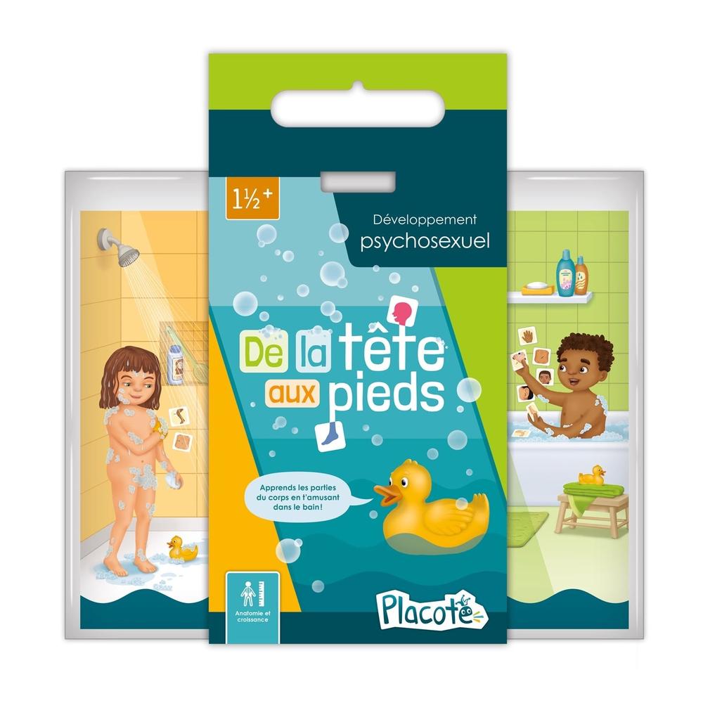 De la tête aux pieds est un jeu pour les enfants de 1½ an à 5 ans qui les invite à découvrir, en s'amusant dans le bain, jusqu'à 30 parties du corps, y compris les organes sexuels. Le jeu répond de façon ludique à la curiosité naturelle des enfants à propos de leur corps et des différences anatomiques. Les cartes et les affiches fournies permettent de nommer, de trouver et de pointer les parties du corps tout en favorisant l'apprentissage de l'hygiène.