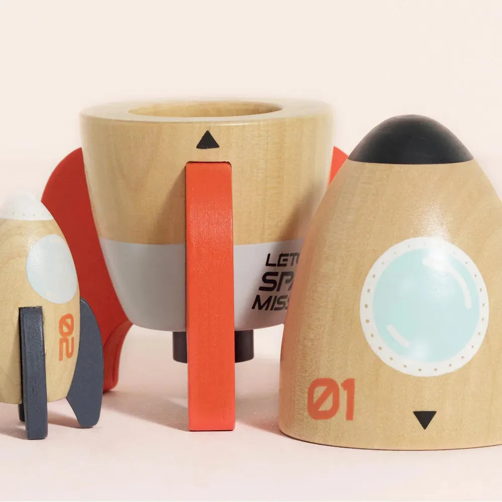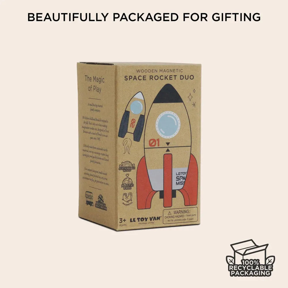 Prêt·e pour le décollage ? Avec ce duo de fusées magnétiques en bois, les petits explorateurs s’envolent vers des aventures intergalactiques imaginaires !