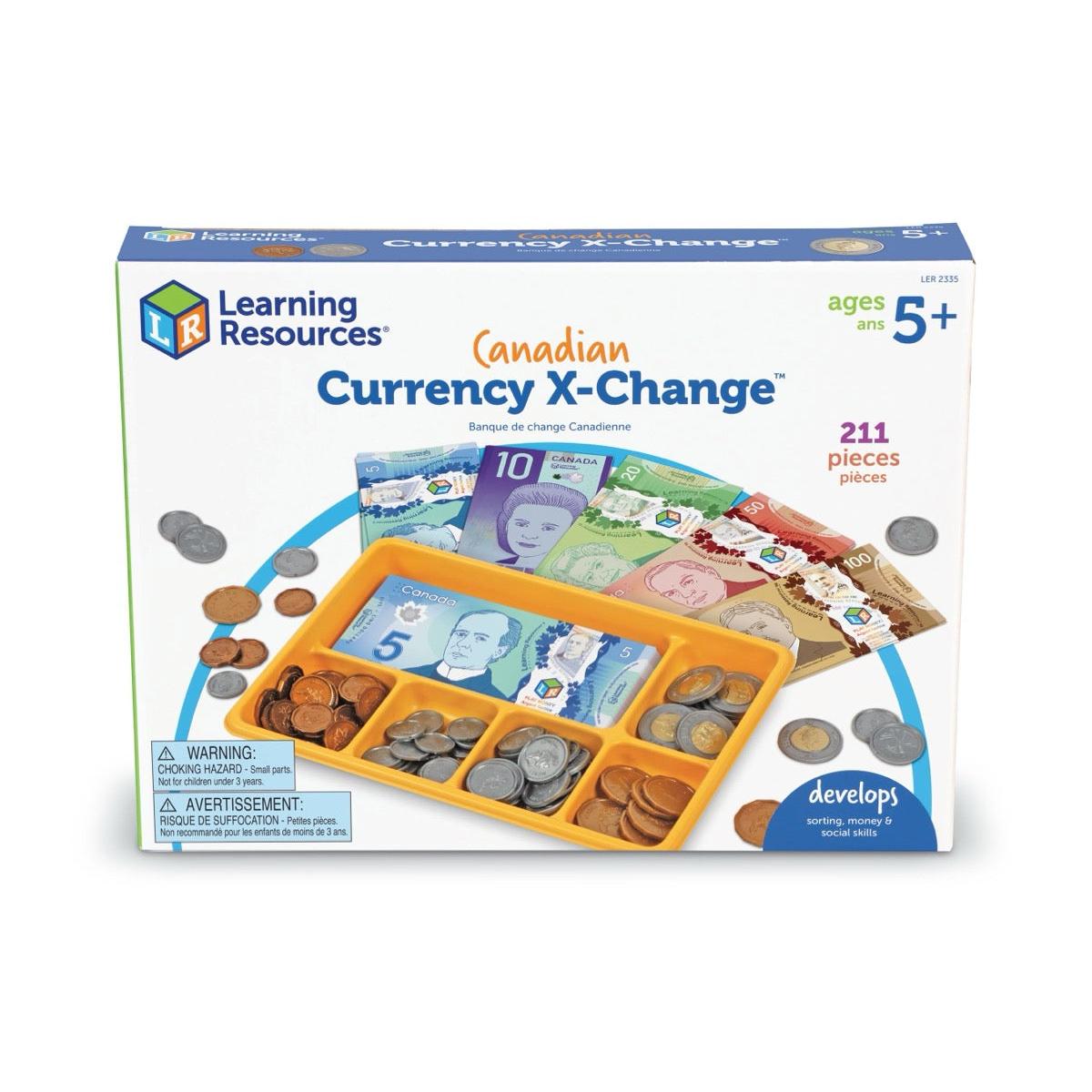 Comprend 110 pièces de monnaie canadiennes en plastique et 100 billets, un plateau à billets en plastique compartimenté et un guide d'activités bilingue