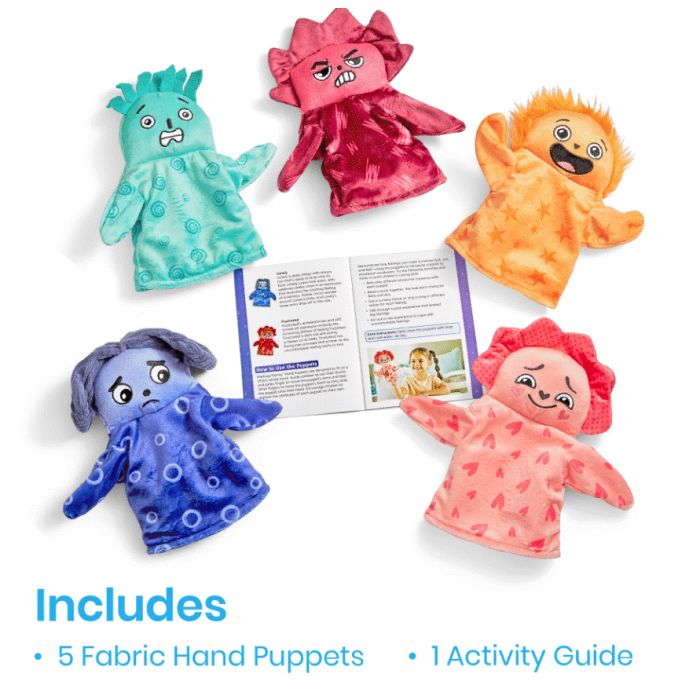 - Il y a 5 marionnettes, chacune montrant une émotion commune à travers son expression faciale et sa couleur - aimé, nerveux, frustré, seul et excité.