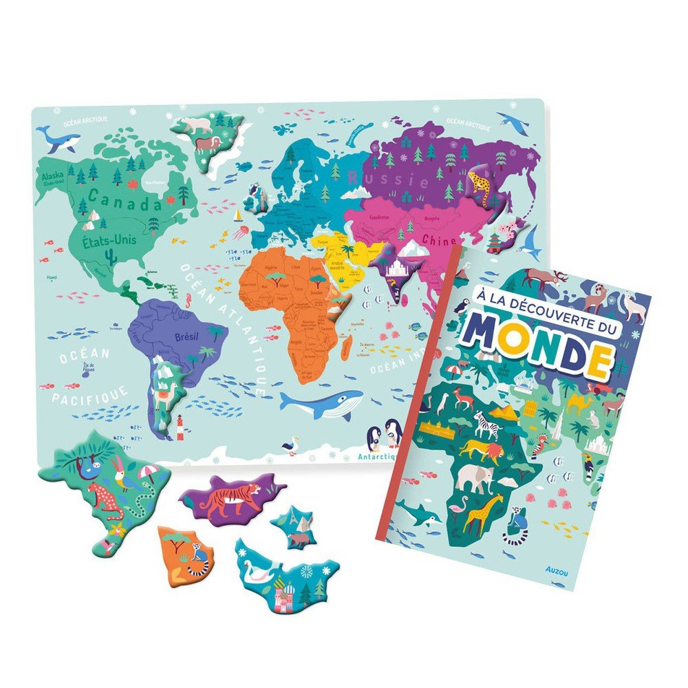 Amuse-toi à compléter un grand poster du monde aimanté grâce aux 80 aimants. Puis pars à la découverte du monde grâce au livre fourni dans la pochette !