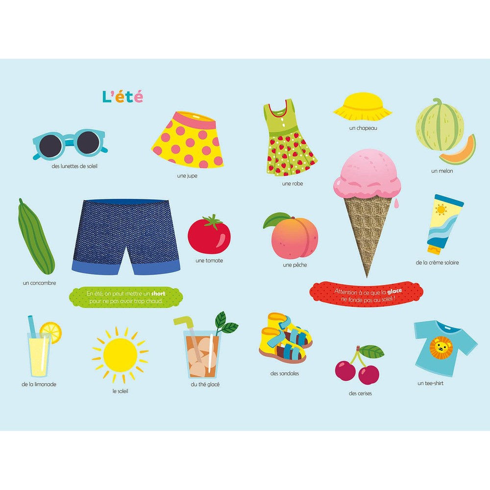 Plus de 20 matières à toucher qui permettent aux petits d'appréhender une nouvelle dimension des objets et mots présentés. Le sens tactile facilite l'appropriation du nouveau vocabulaire et sa mémorisation.