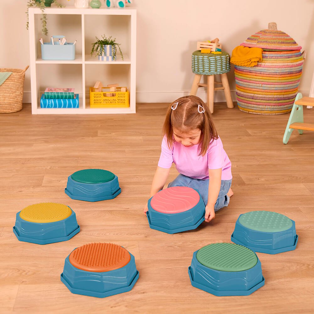 Découvrez notre incroyable ensemble de modules sensoriels - Balance & Hop Stepping Stones! Cet ensemble comprend 6 modules octogonaux aux surfaces sensorielles différentes. Les possibilités de configurations sont infinies, offrant ainsi une expérience de jeu variée et amusante. Les modules sont texturés et colorés, attirant l'attention des enfants.