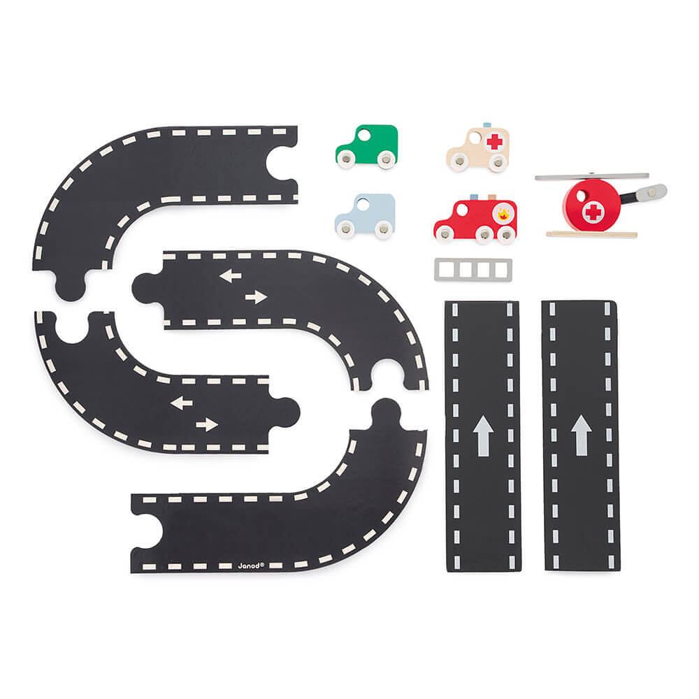 Comprend : 2 voitures, 1 ambulance, 1 camion de pompiers et 1 hélicoptère pour pouvoir jouer jusque dans les airs !