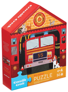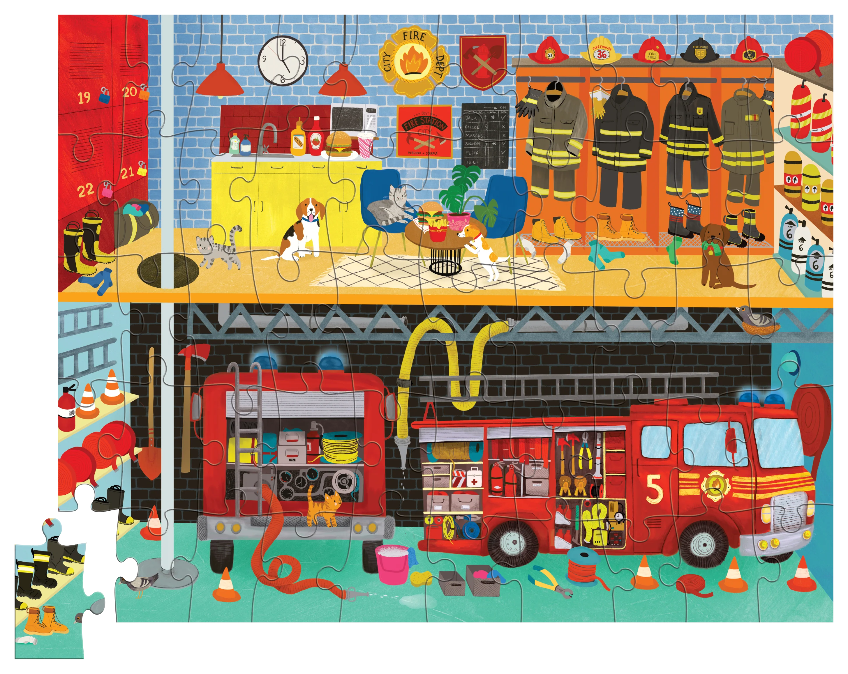 Prêts à partir à la rescousse ! Le puzzle « Caserne de pompiers » de Crocodile Creek transporte les enfants au cœur de l’action avec une illustration colorée représentant une caserne animée et un camion de pompiers prêt à intervenir.