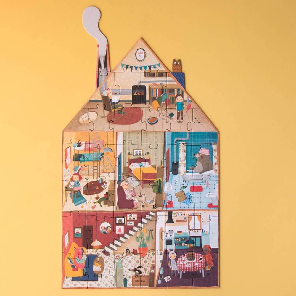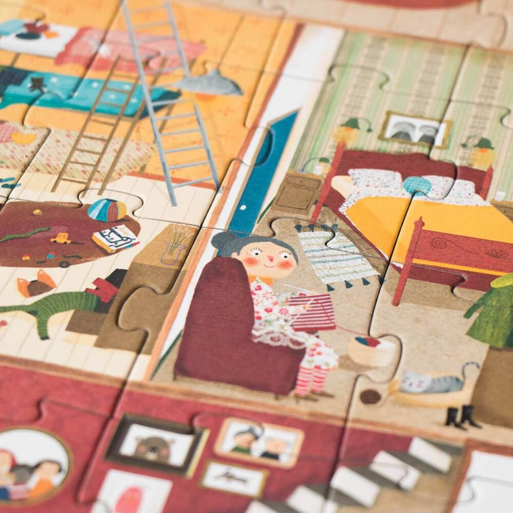 Un puzzle réversible de 36 pièces qui montre deux scènes de la même maison. D'un côté, nous voyons l'extérieur de la maison et de l'autre, nous voyons l'intérieur de la maison, et pouvons profiter de tous les personnages et bizarreries à l'intérieur !