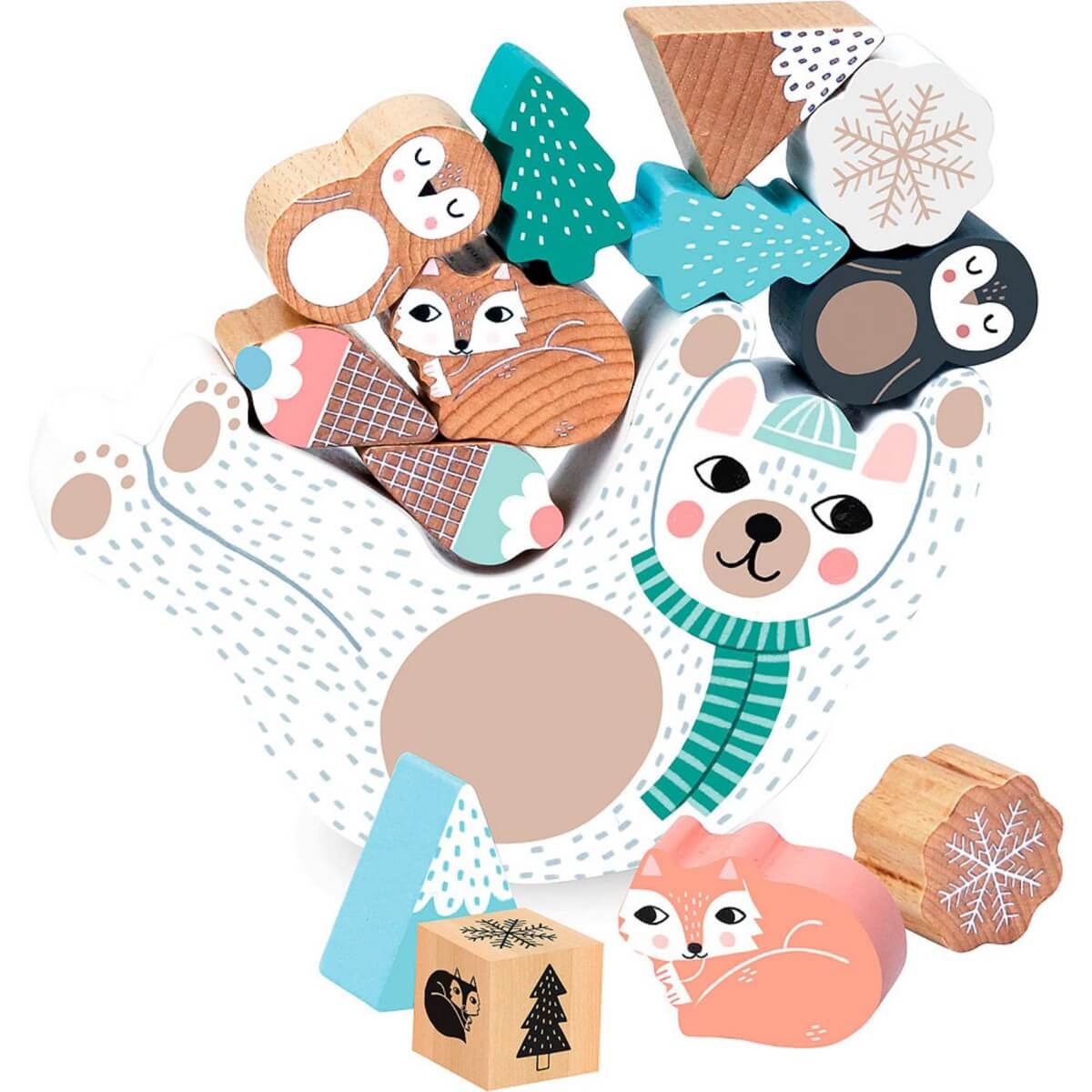- Contenu : Un socle ours blanc, 12 pièces en bois et 1 dé.