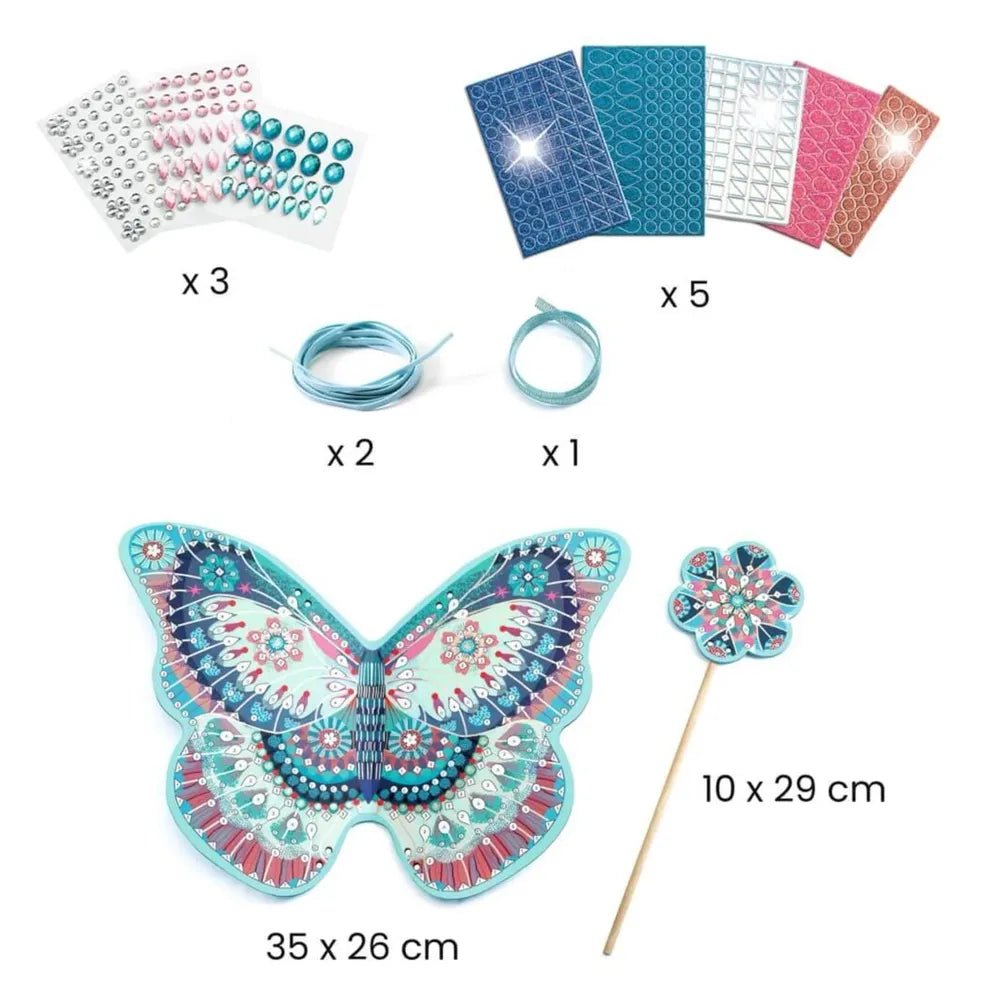 Ce coffret contient une baguette magique et une paire d’ailes de fée à personnaliser soi-même. L’enfant suit les nombres imprimés sur les accessoires et colle les autocollants pailletés en mousse et strass pour un résultat scintillant et féerique.