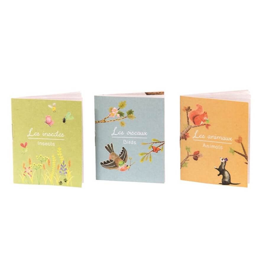 Livrée dans une petite boîte cartonnée aux illustrations champêtres, nous trouvons à l'intérieur trois mini-livres à thème. Votre bambin se familiarisera ainsi au monde qui l'entoure et s'amusera à reconnaître les différents animaux, oiseaux et insectes peuplant nos forêts et jardins, en français et en anglais.