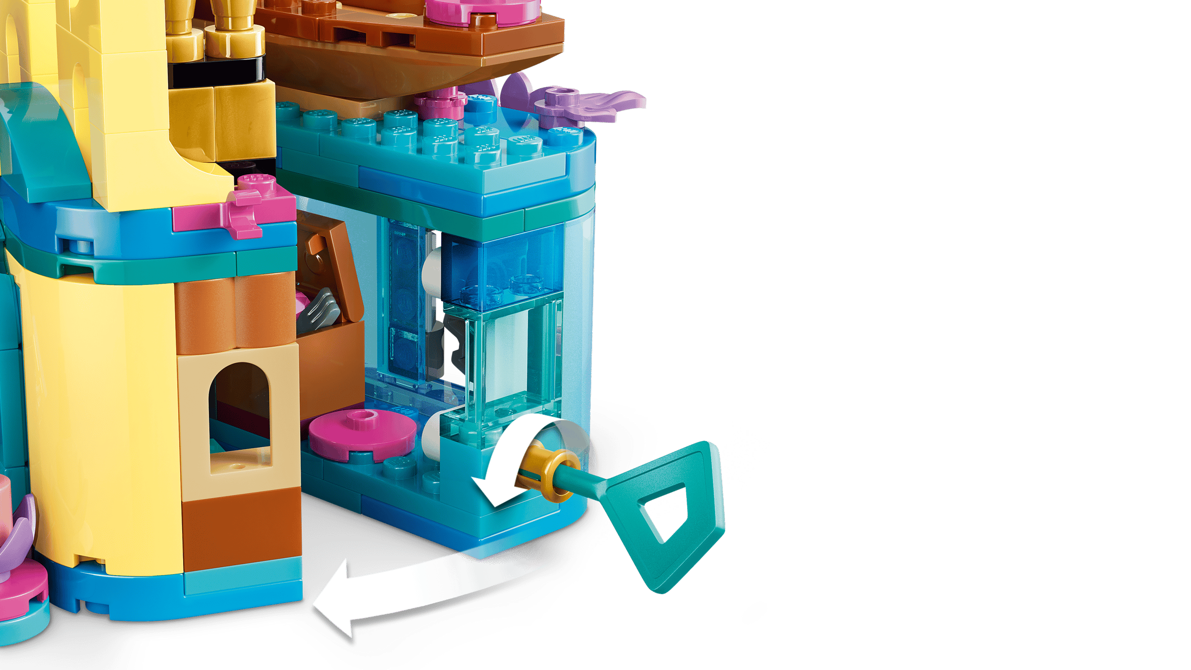 Ce micro-palais portable s’ouvre pour révéler un décor rempli de détails inspirés du film: la grotte d’Ariel, un coffre au trésor et un petit bateau pour explorer l’océan. Une clé permet même de déverrouiller le palais, ajoutant une touche interactive au jeu.