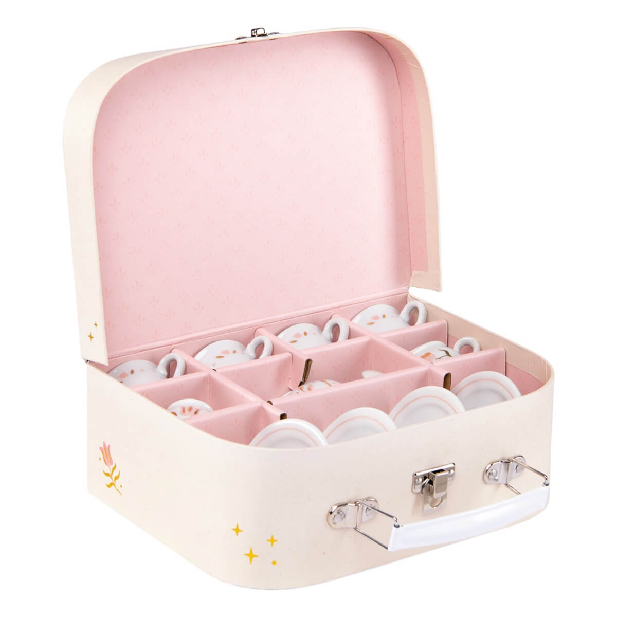 Service à thé en porcelaine orné de délicats motifs roses et dorés, présenté dans un ravissant coffret illustré pour servir le goûter à sa maman et ses amies les petites souris.