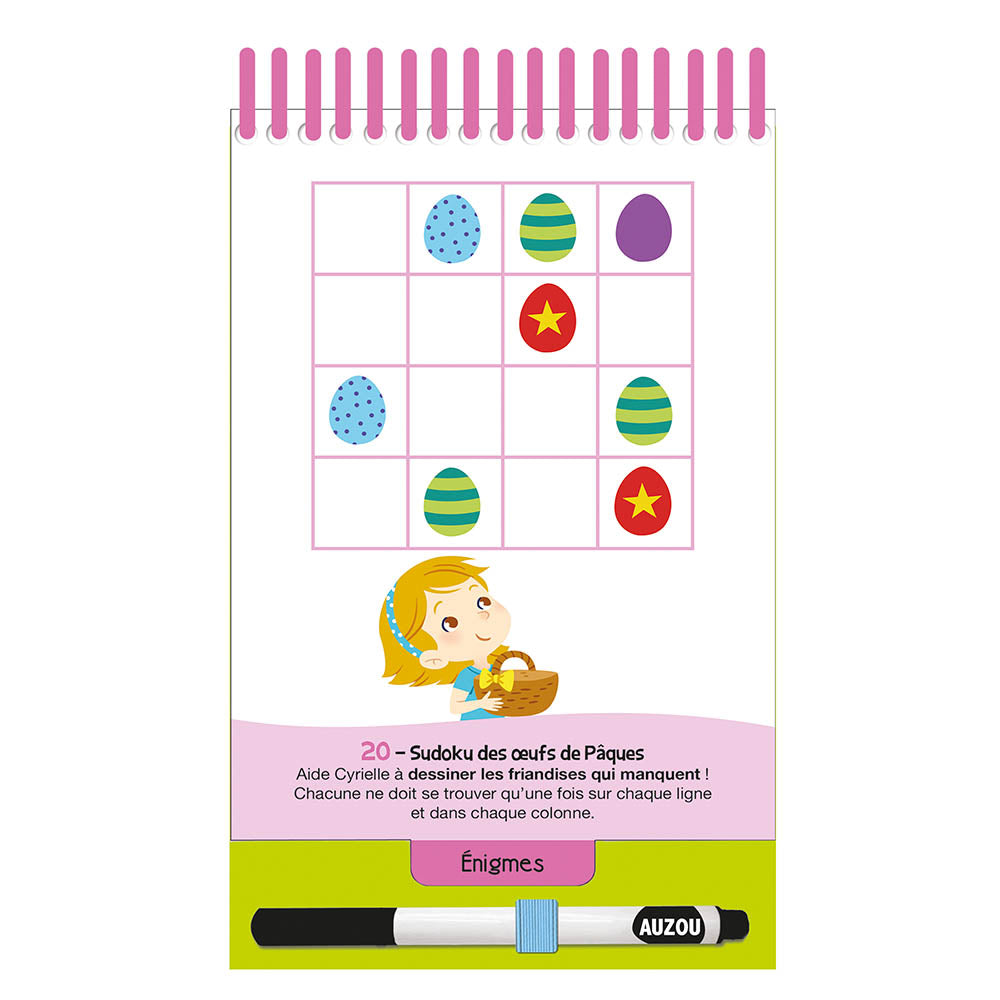 45 jeux déclinés en 3 parties : 15 jeux d’observation, 15 énigmes et 15 labyrinthes. Avec 5 pages de solutions à la fin.
