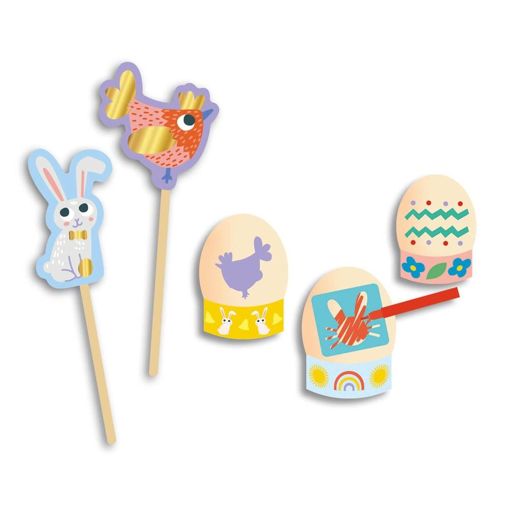 Une pochette complète pour partir à la chasse aux œufs de Pâques ! Elle propose des pochoirs autocollants et des feutres pour décorer des œufs, un joli panier pour y mettre les chocolats, des autocollants brillants et des décorations à planter pour mettre sa maison au goût de la fête du chocolat!