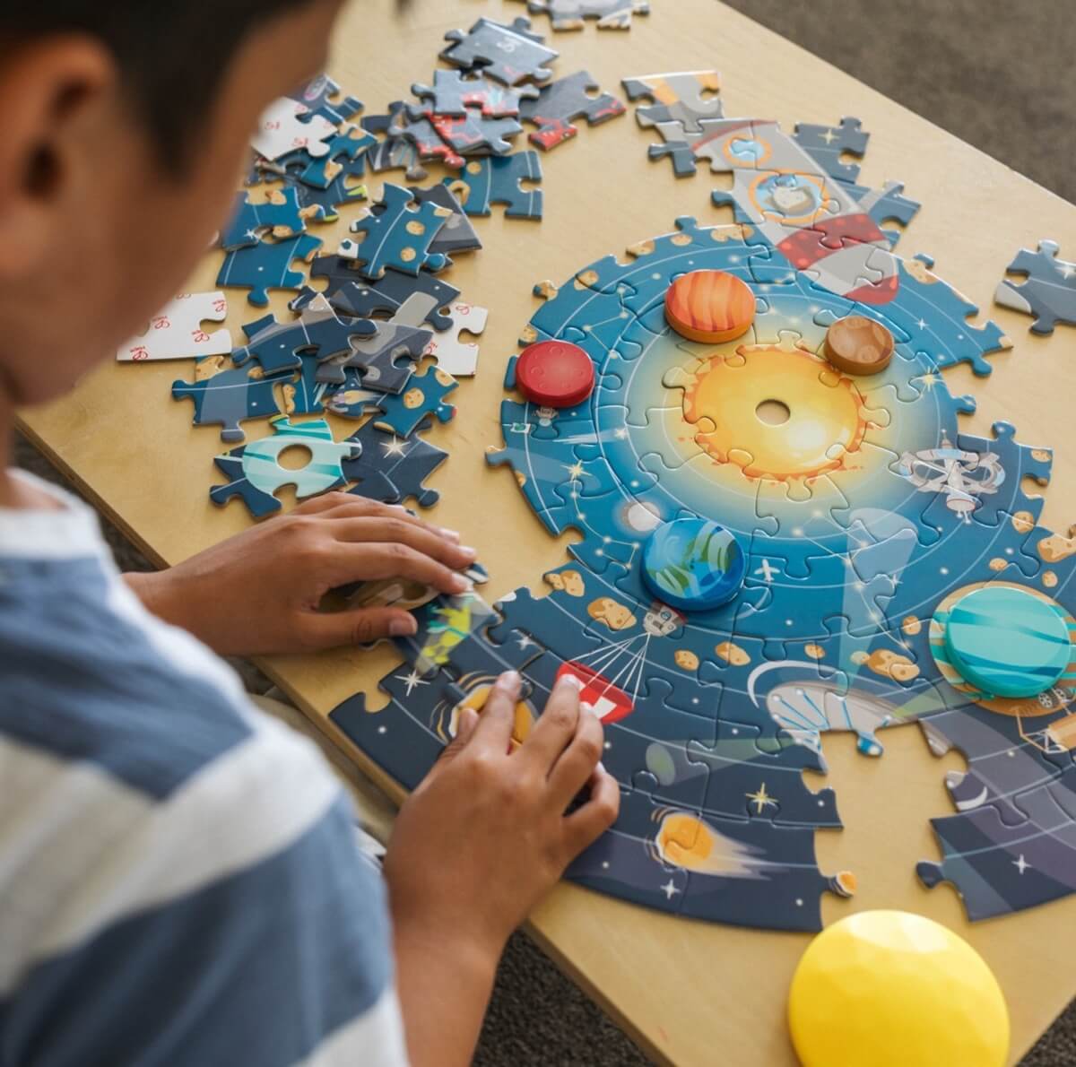 - HUIT PLANÈTES : Les planètes, dont Mercure, Vénus, la Terre, Mars, Jupiter, Saturne, Uranus et Neptune, peuvent être positionnées au-dessus du puzzle. Explorez les planètes, puis revenez sur terre en toute sécurité