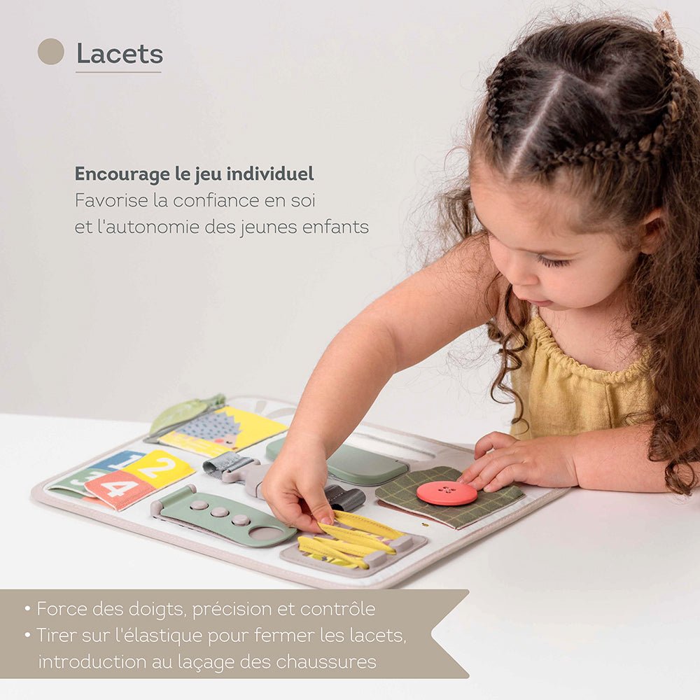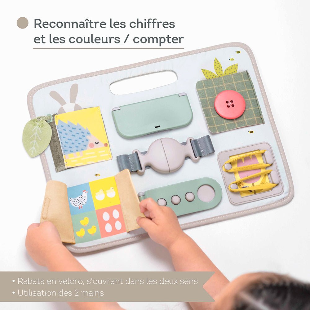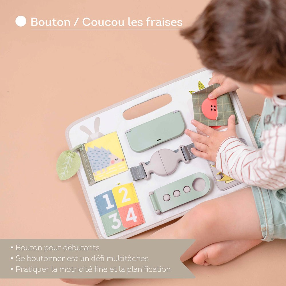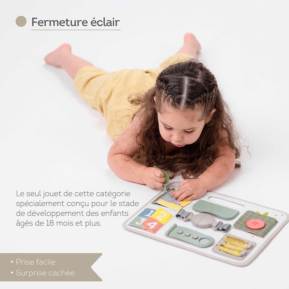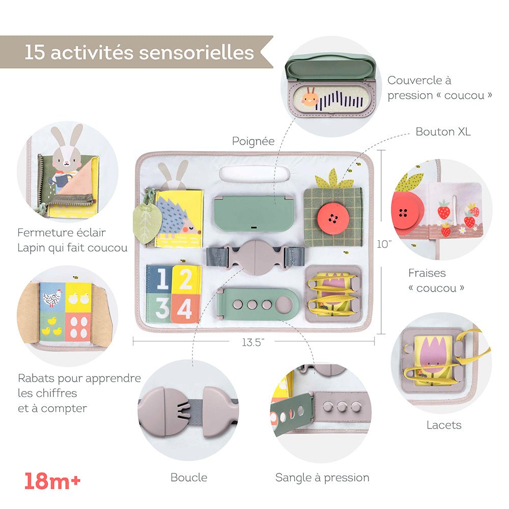 Les activités comprennent la fermeture à glissière, le bouton XL, les rabats en velcro, les lacets, le couvercle à pression, la boucle, la sangle à pression, les activités ''coucou'', les nombres, les quantités et le comptage.
