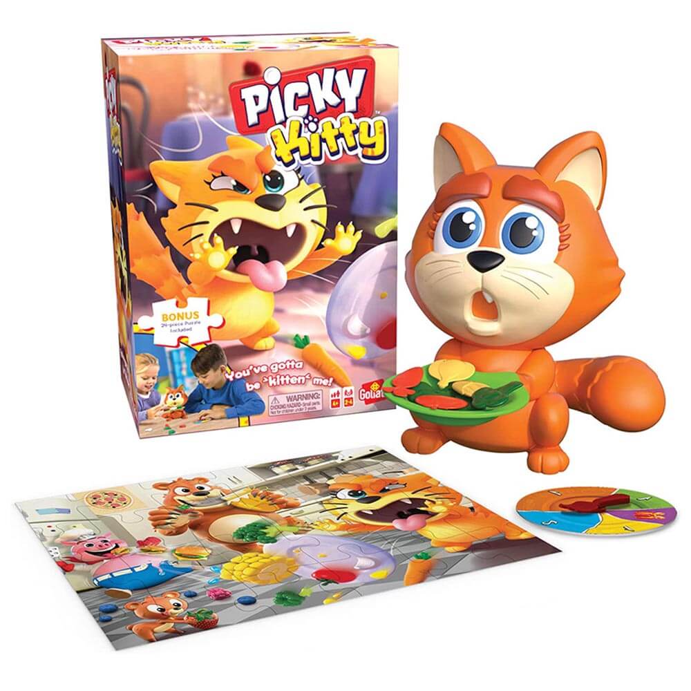 Contenu : 1 Minet Gourmet, 20 légumes (tomates, carottes, brocolis, salades, épis de maïs, ail), 1 roue, la règle du jeu. Aucune pile nécessaire.