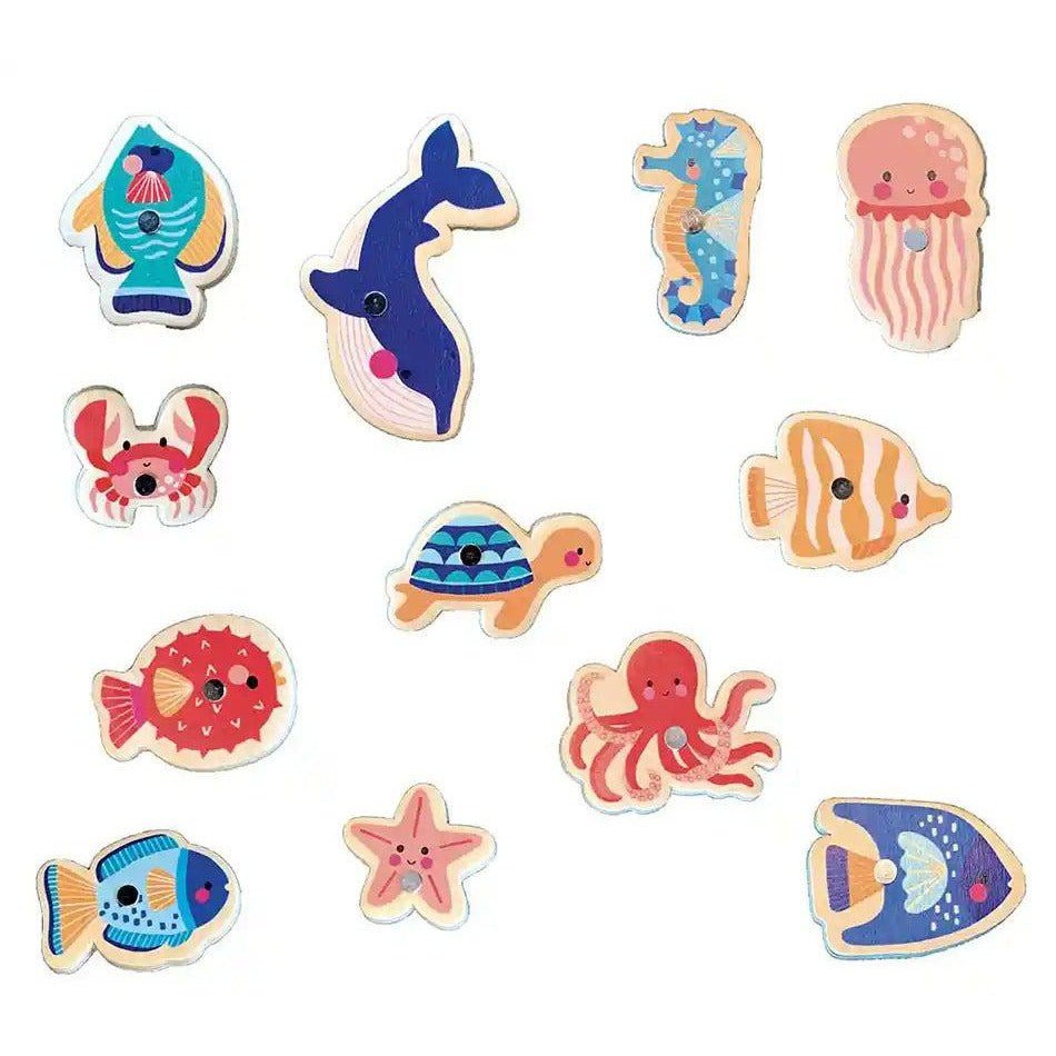 Comprend: 2 cannes à pêche en bois aimantées, 12 animaux marins en bois, et 2 façons de jouer:
