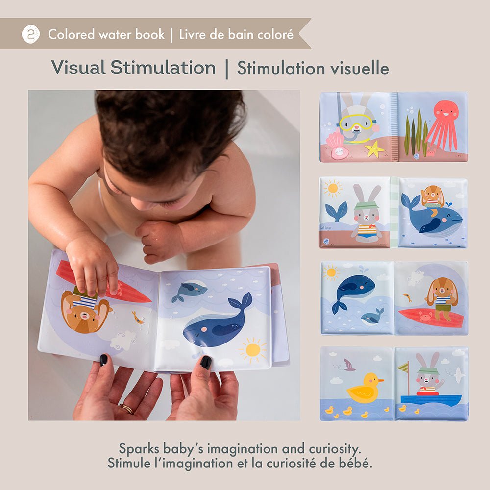 - Stimulation visuelle : Notre livre de bain capte l'attention de bébé et favorise l'exploration visuelle alors qu'ils observent les couleurs vibrantes et les illustrations mignonnes.