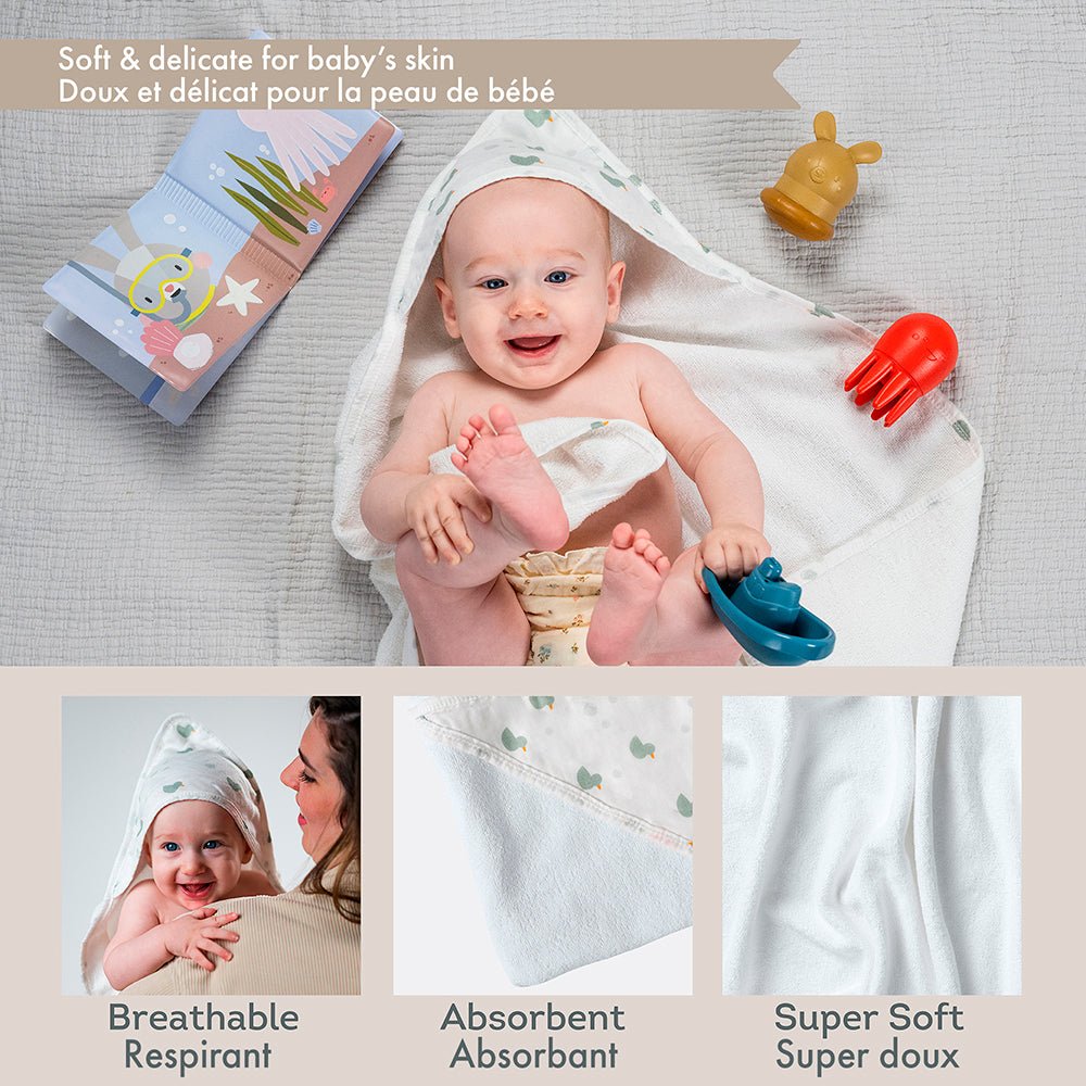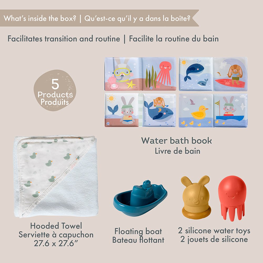 Cet ensemble comprend une serviette à capuche douillette pour s'envelopper délicatement après une douche rafraîchissante, 2 jouets de bain en silicone ludiques qui font de l'eau, arrosent et un jouet de bateau pour un plaisir infini lors du bain. Le livre de bain à l'eau stimule l'imagination et la curiosité de bébé.