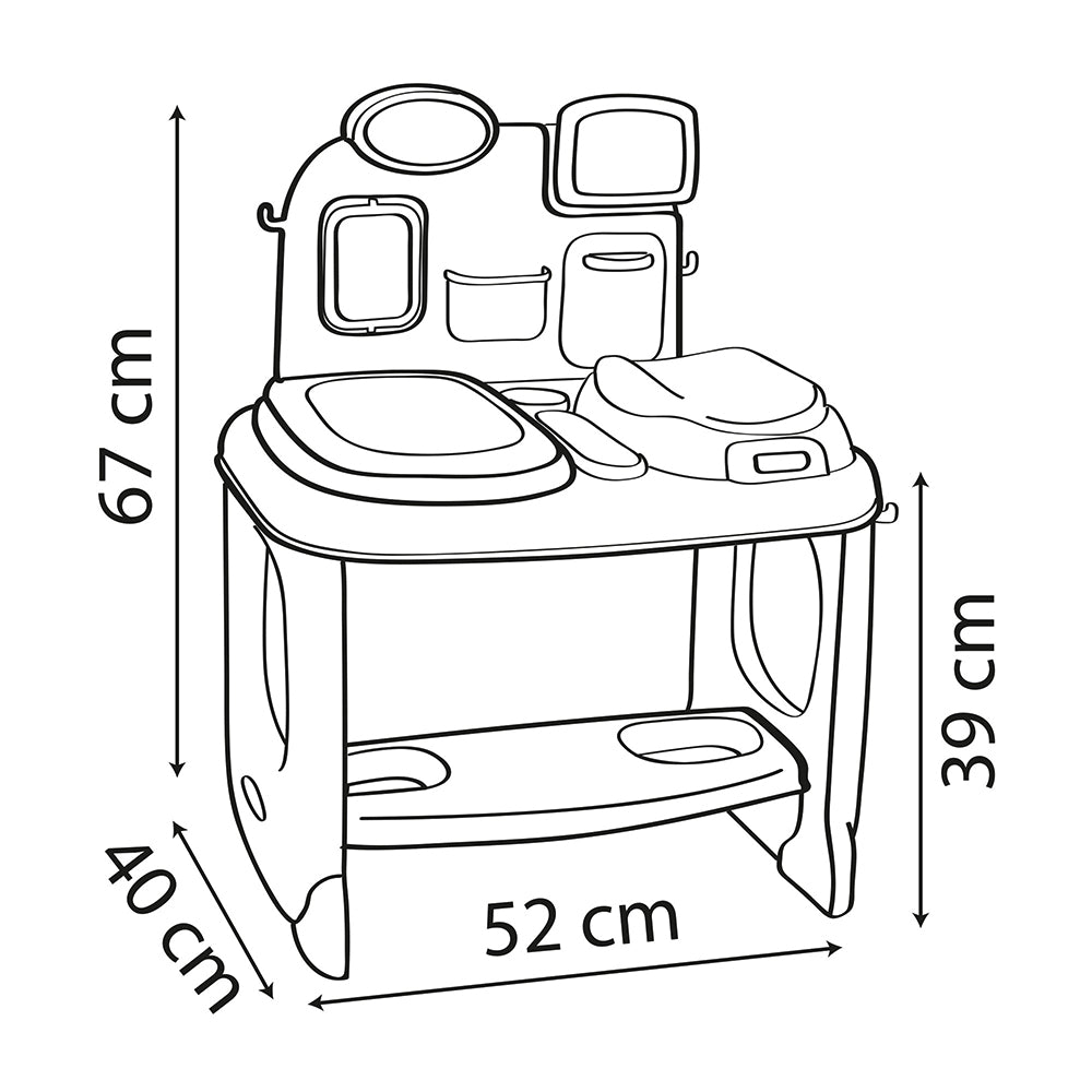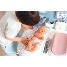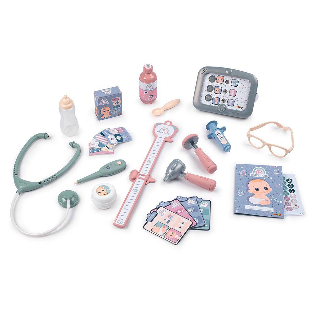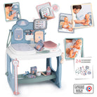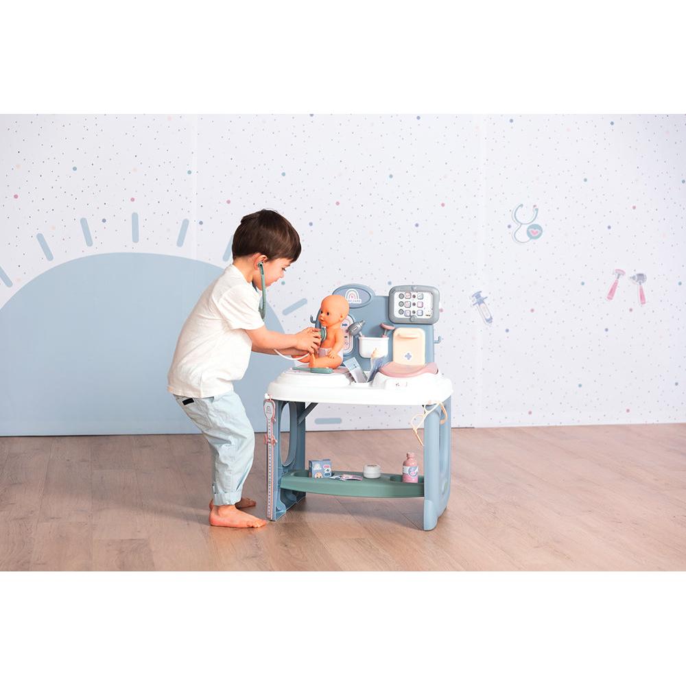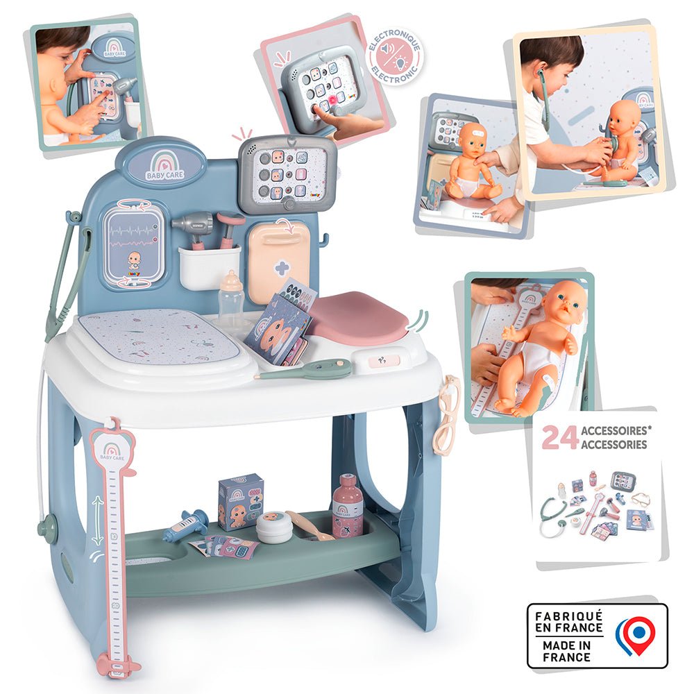 Ce centre pour poupées dispose d'une balance pour bébés, d'une trousse de premiers soins, d'un stéthoscope et bien plus encore. Votre petit médecin en herbe pourra utiliser sa tablette électronique pour consulter les antécédents médicaux de la poupée, prendre des mesures avec la règle de mesure et enregistrer les résultats dans le carnet de santé fourni.