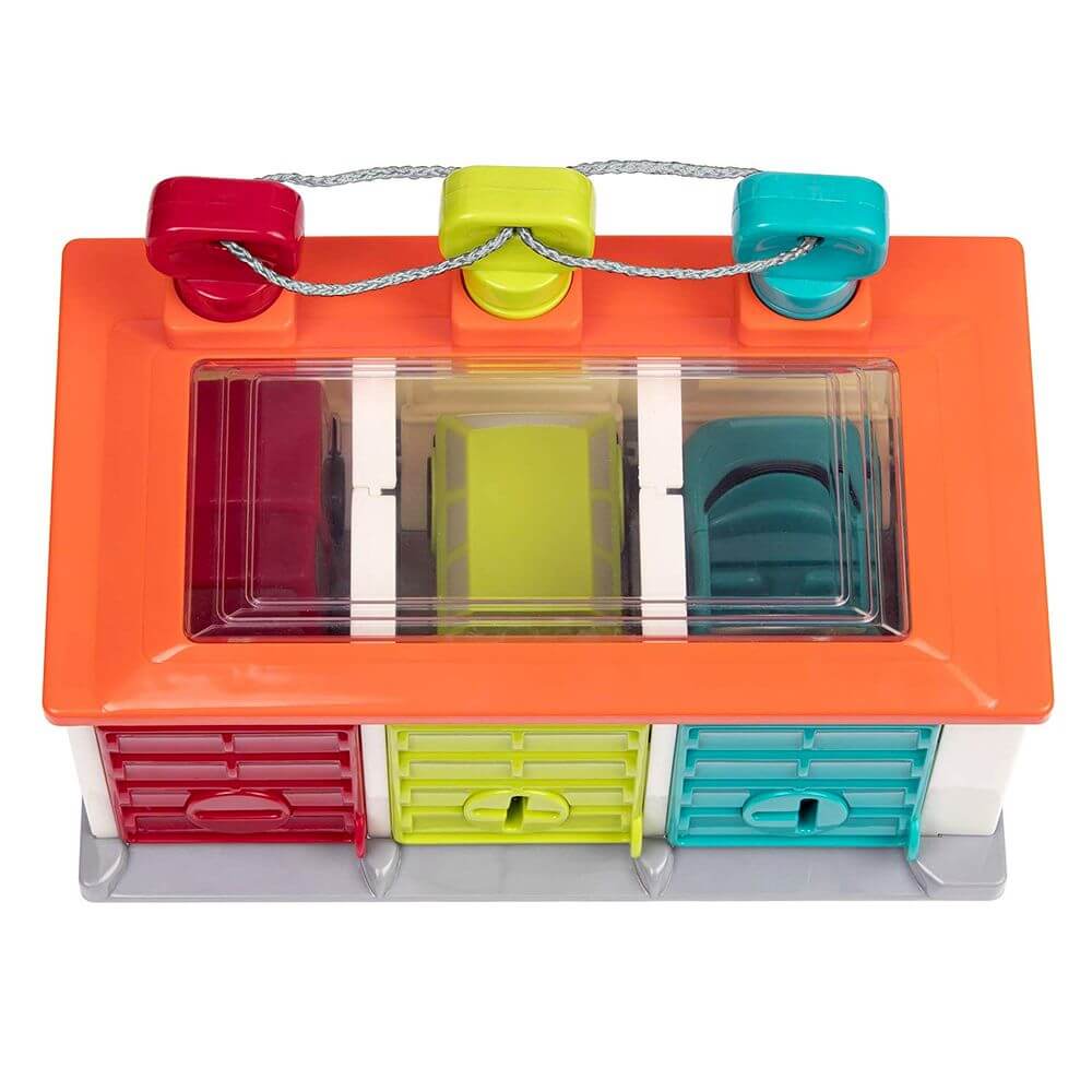 Vroom-vroom! With this interactive garage set, your child can drive cars and park them. Place each of the three keys in the corresponding hole to open the doors. They are assorted by color and shape, which doubles the educational fun!