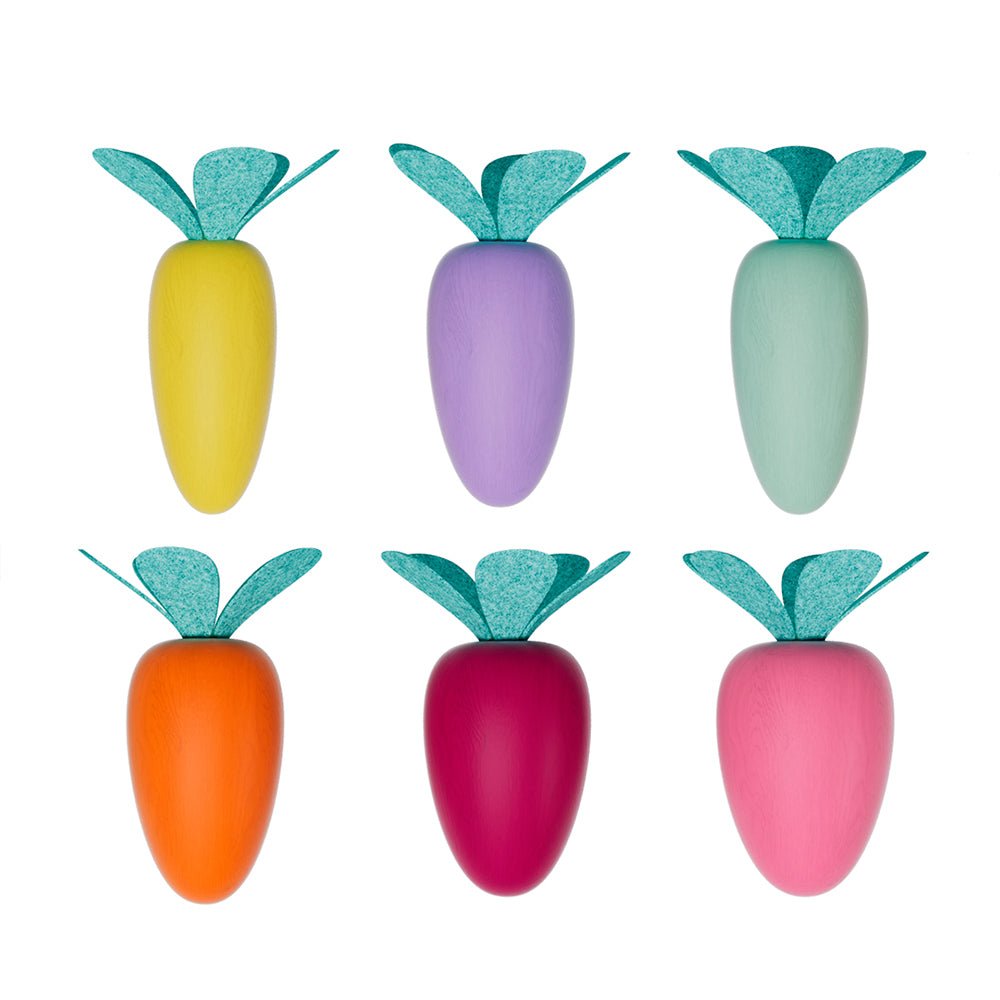 - 10 wooden carrots of different sizes and colors