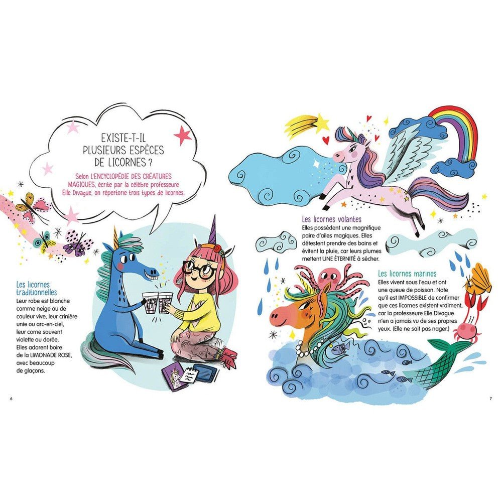 In this very funny book, you will learn everything you always wanted to know about unicorns thanks to the research of the world's leading expert Professor ELLE DIVAGUE: Are there any boy unicorns? What are the stages of a unicorn's growth? Do they go to school? What are their favorite jobs? Do they fall in love and do they like jokes?