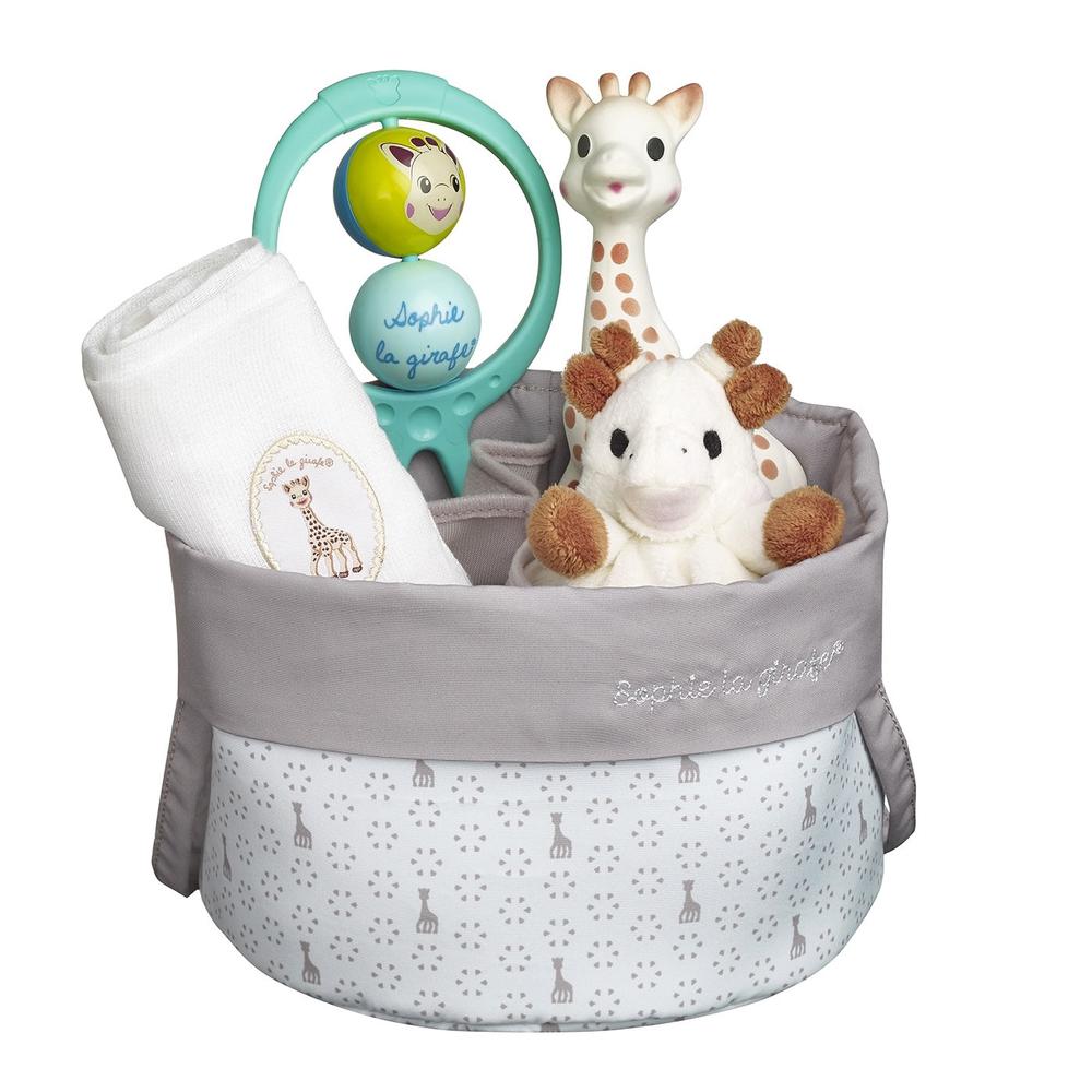 An ideal birth gift including: a basket with handles, Sophie the Giraffe, a comforter with pacifier, a 100% cotton swaddle (70x70 cm) and a swing rattle.