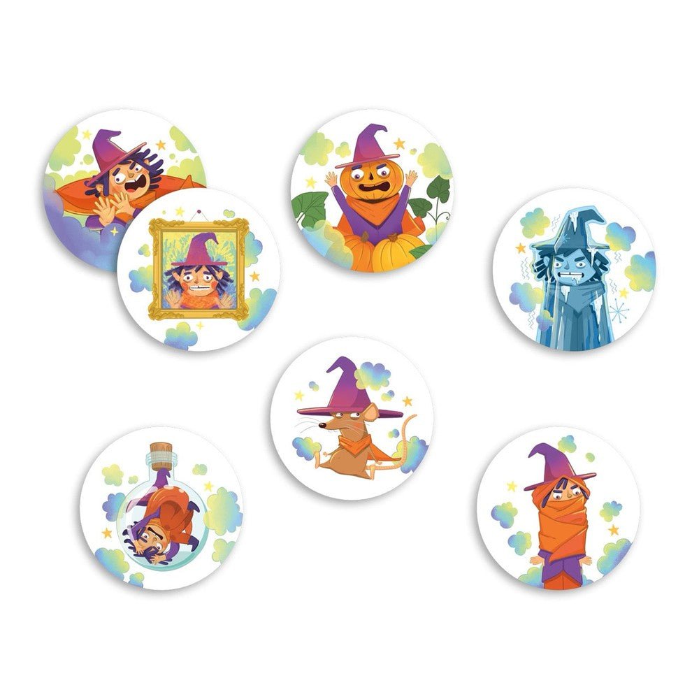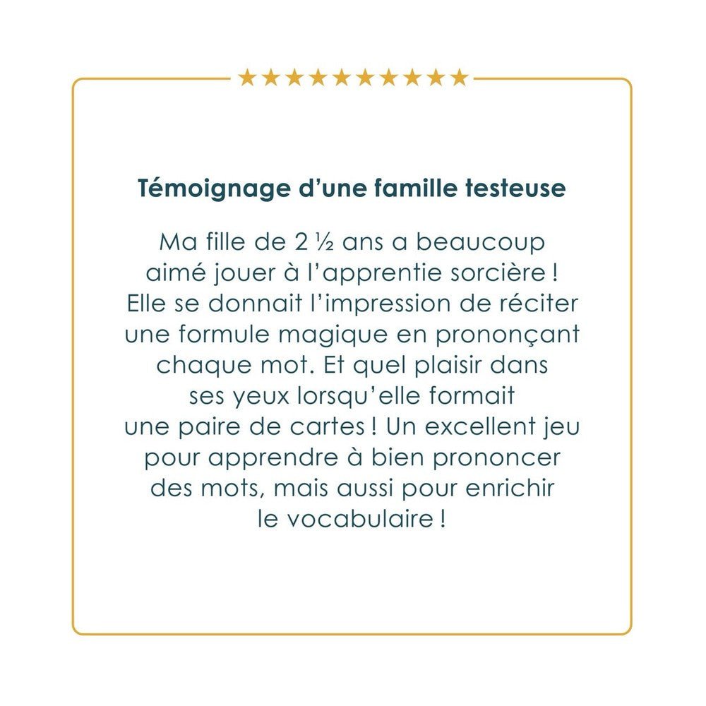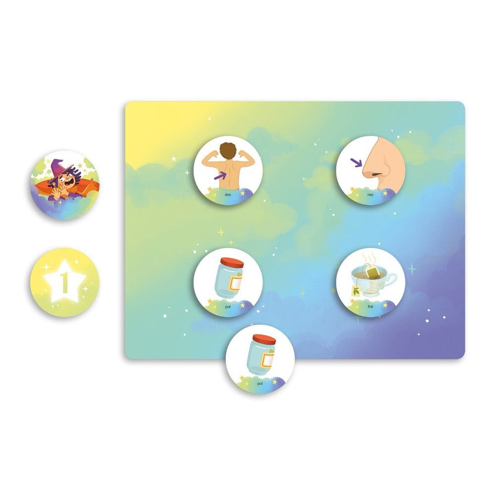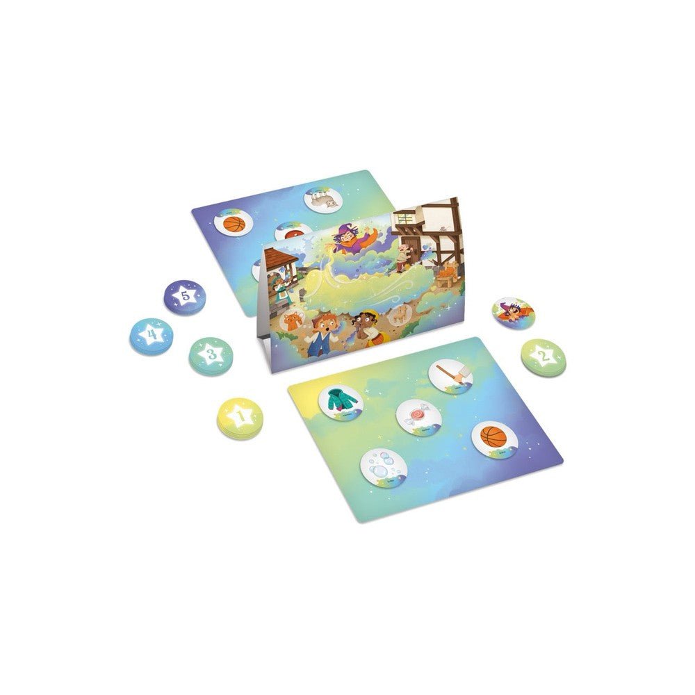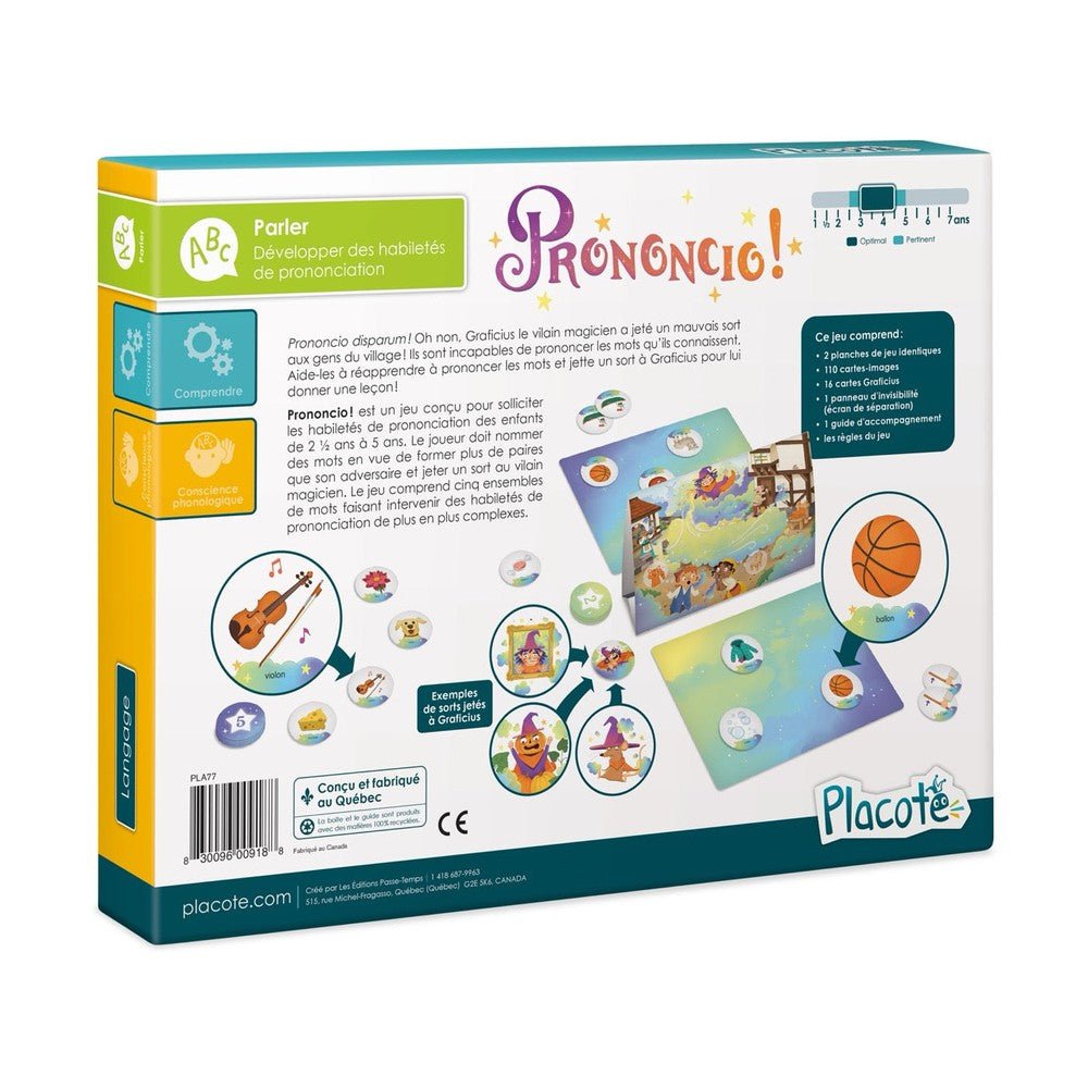 Prononcio! is a game designed to challenge the pronunciation skills of children ages 2.5 to 5. Players must name words in order to form more pairs than their opponent and cast a spell on the evil magician. The game includes five sets of words that require increasingly complex pronunciation skills.