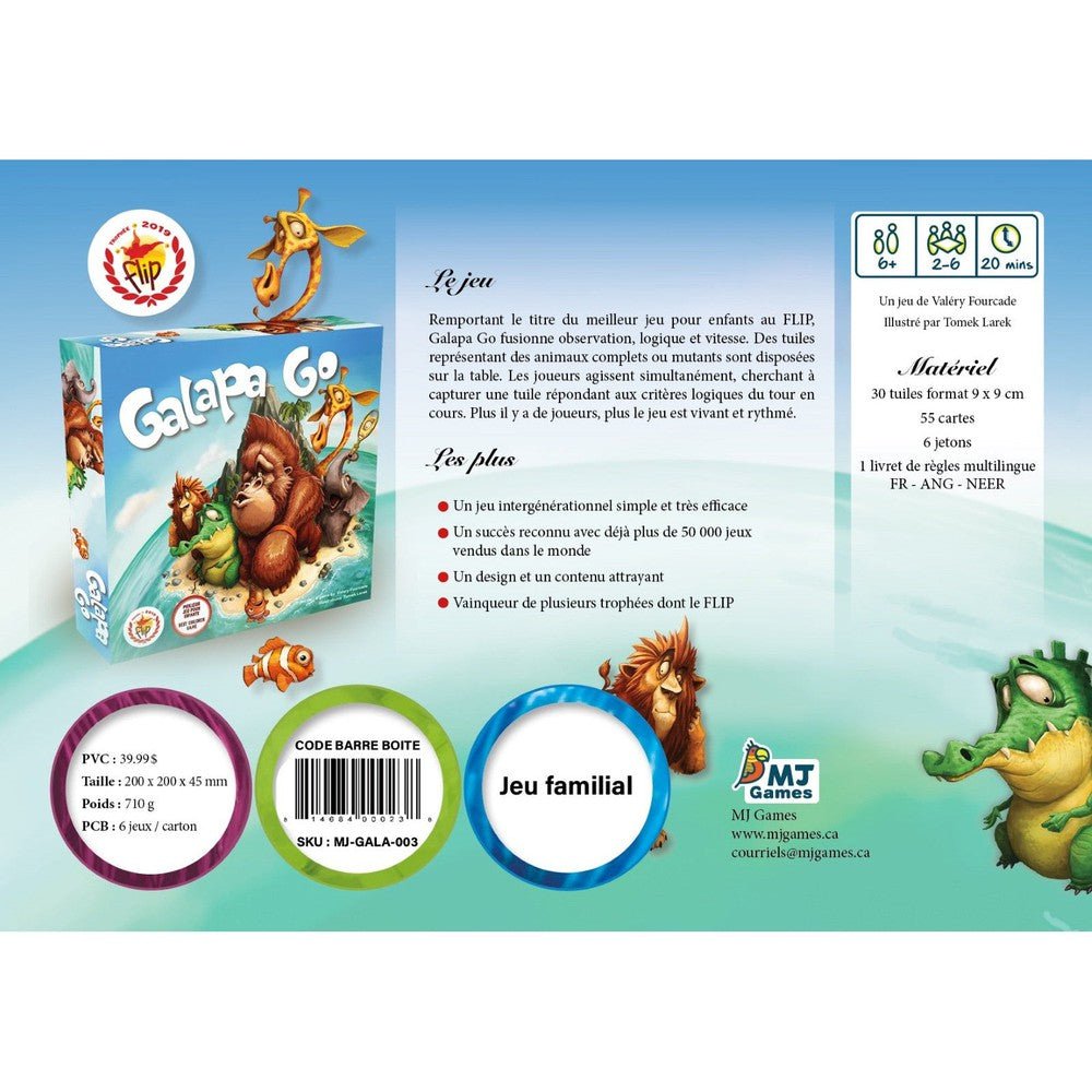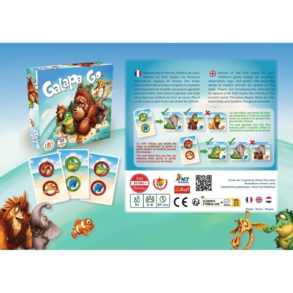 Winning the title of best children's game at FLIP, Galapa Go combines observation, logic, and speed. Tiles representing complete or mutated animals are placed on the table. Players act simultaneously, seeking to capture a tile that meets the logical criteria of the current round. The more players there are, the more lively and fast-paced the game becomes.