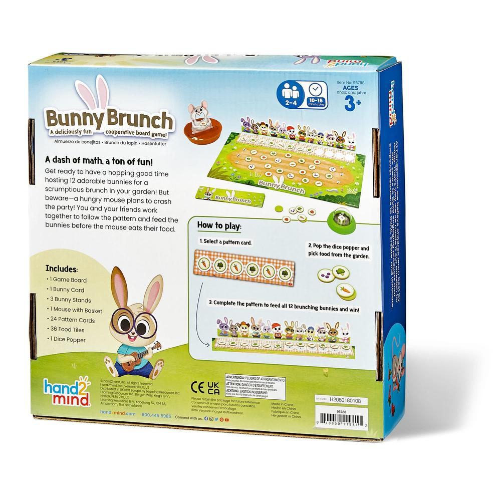 Contents: game board, 1 rabbit card, 3 rabbit stands, 1 mouse, 24 pattern cards, 36 food tiles, dice roller.