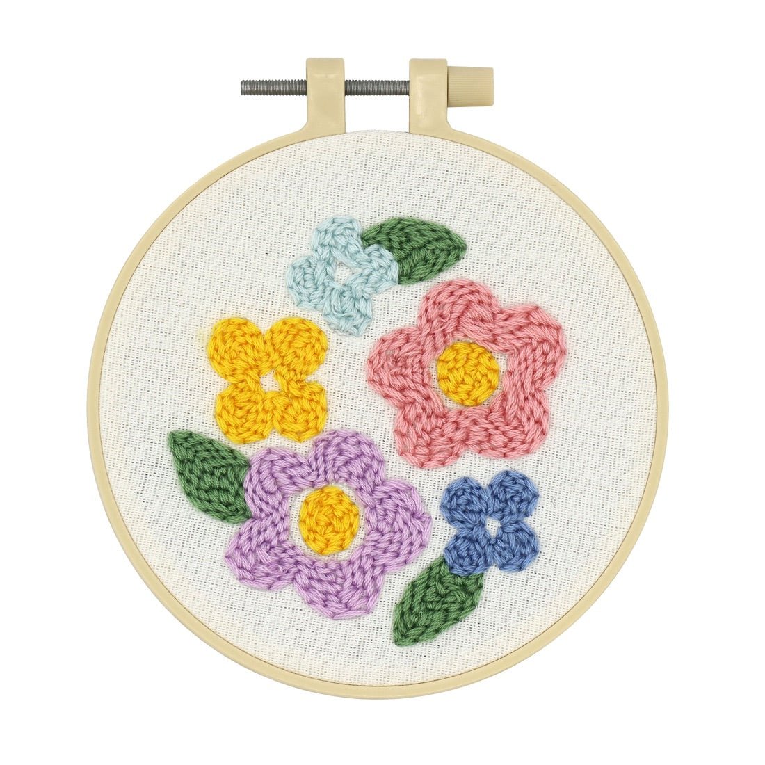 A miniature punch needle embroidery kit with a colorful floral design. Ideal for a small decorative project. All materials are included.