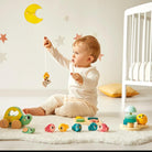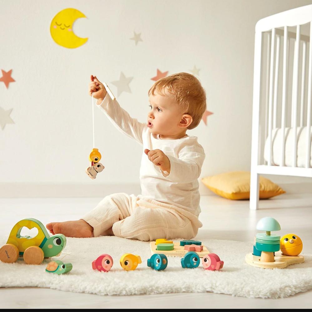 First, a wooden pull-along turtle with her baby: the little turtle figure is removable, allowing you to walk the mother turtle in two different ways (by pulling the string or holding her by the shell). This is the perfect pull-along toy to encourage your little one to move around!