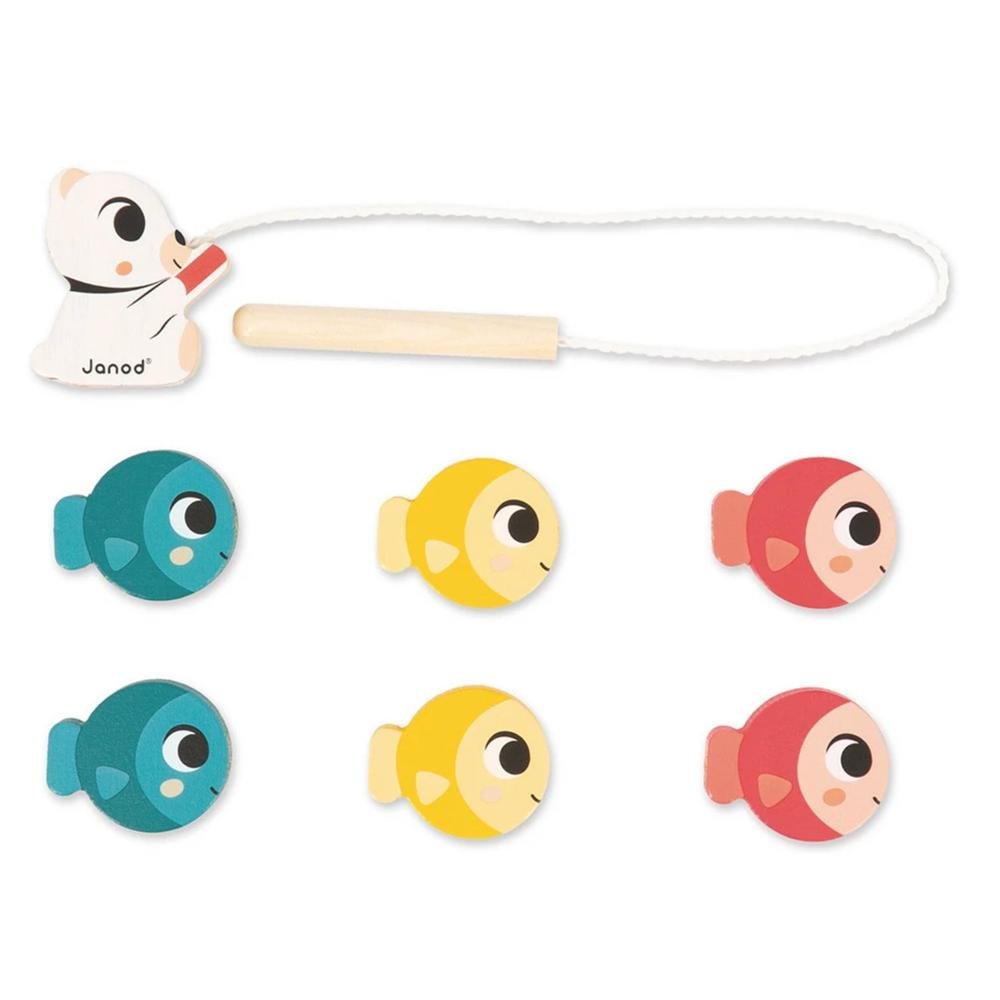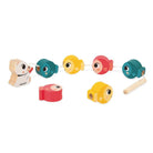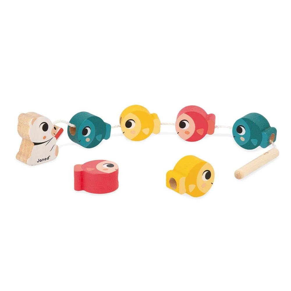 You also have 6 fish-shaped beads to thread: it looks like our friend the bear had a good catch! The wooden guide at the end of the cord makes threading the beads easier.