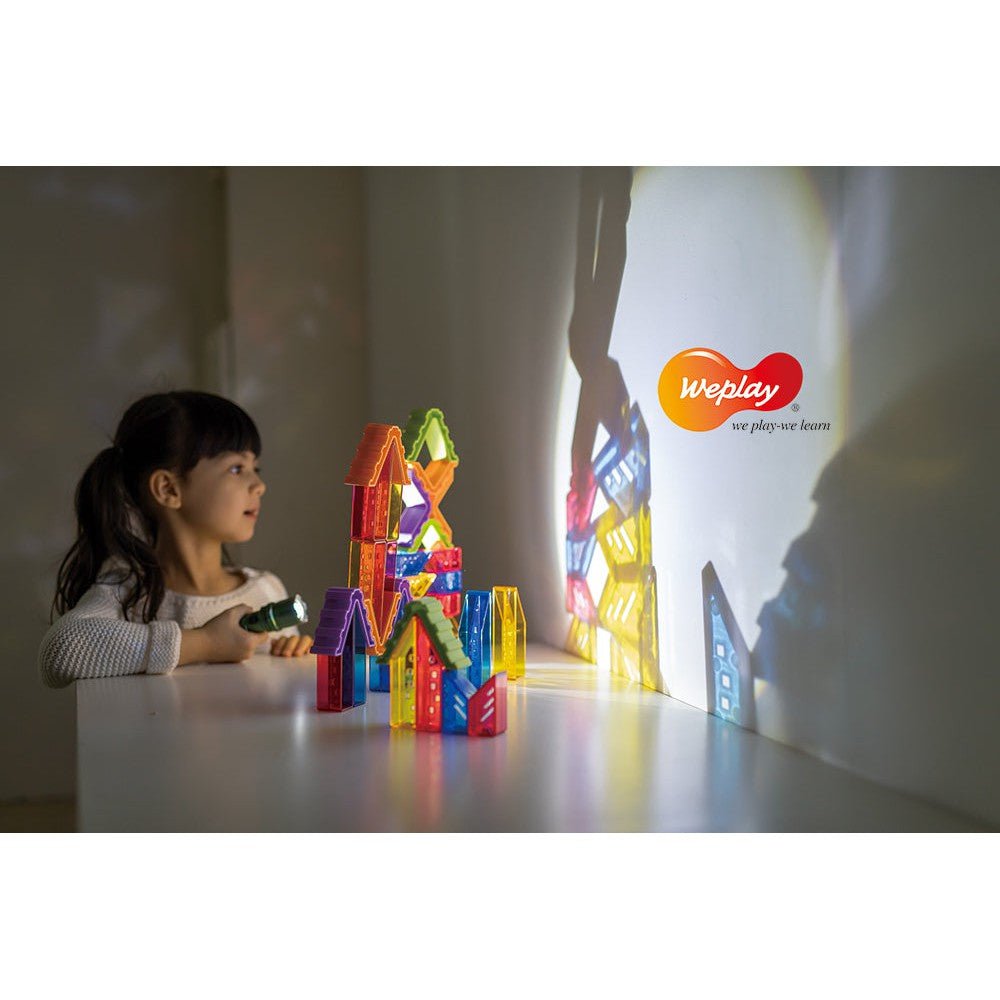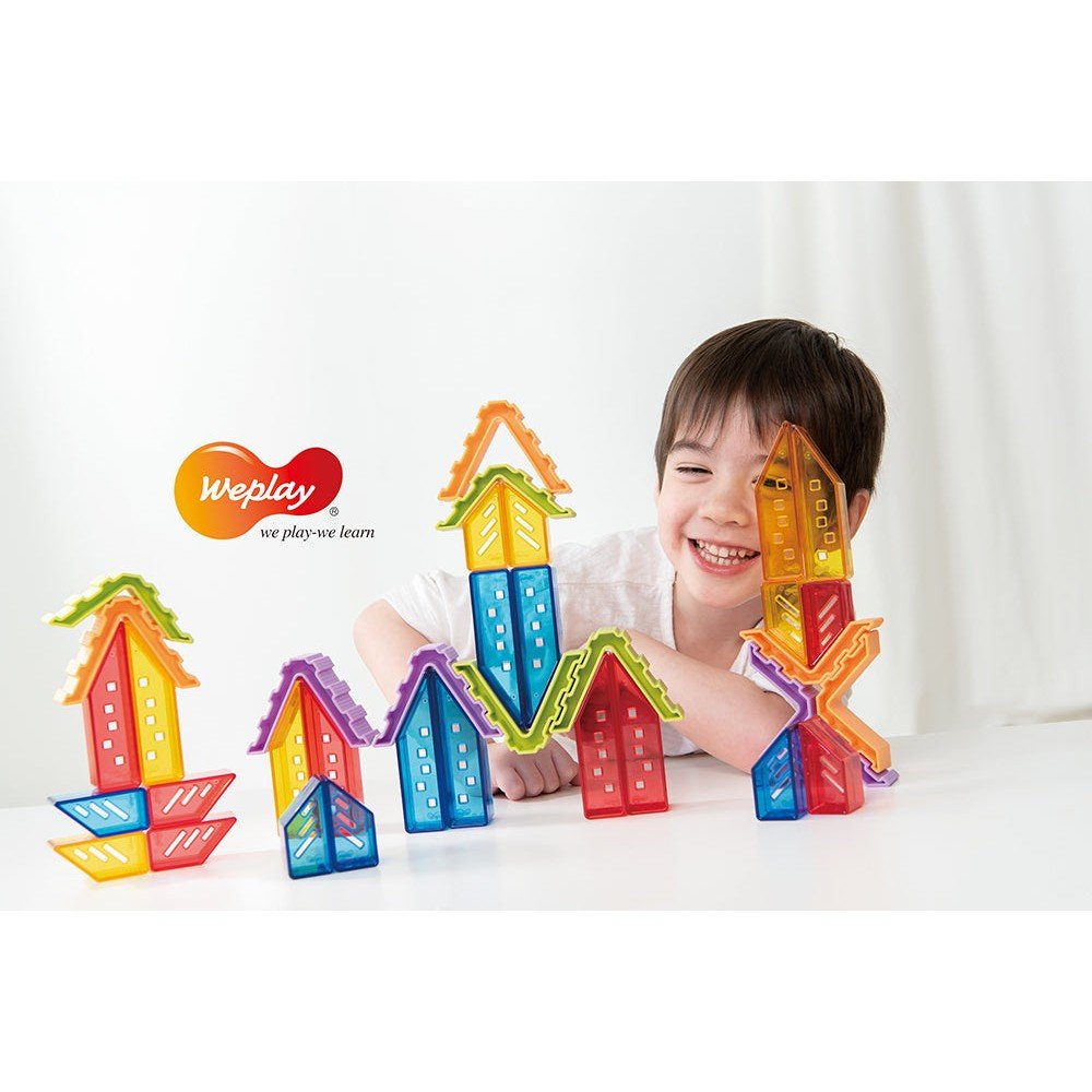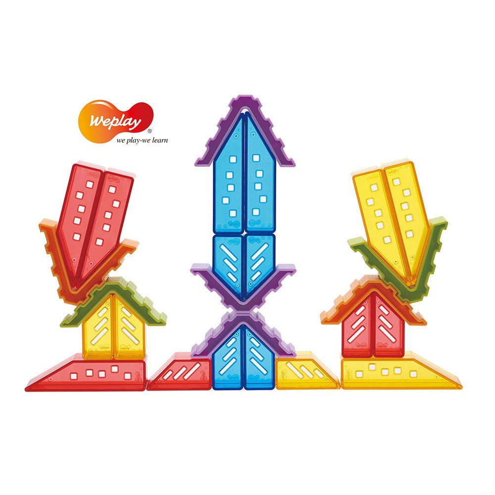 Wow! The houses are bright and colorful, it must be the Crystal Village! There are 6 tall houses, 6 short houses, and 2 different roof block angles. The concept of angles is introduced through play. This set provides a perfect platform for children to learn about primary colors and color mixing.