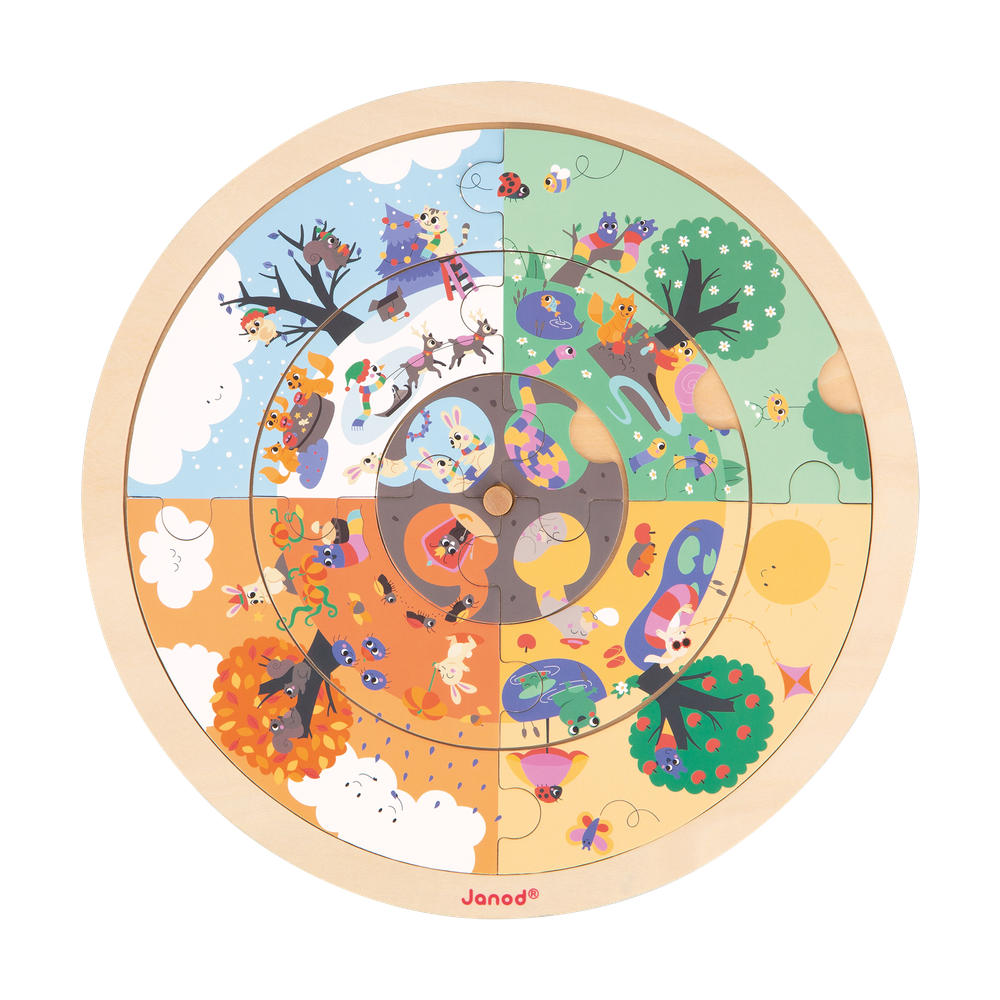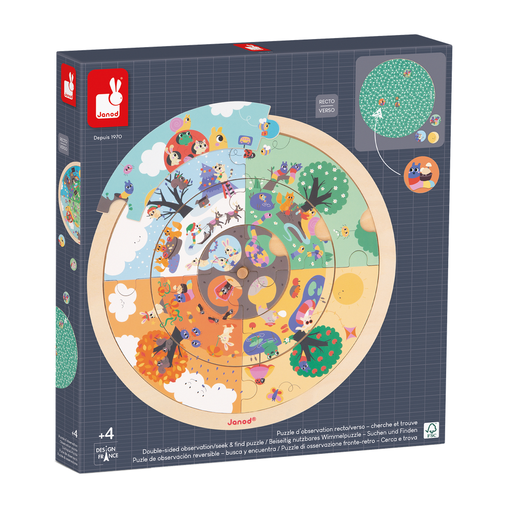 On the back of this educational puzzle, the seasons are right at your fingertips: your child can assemble and manipulate the pieces to recreate the four seasons. It's a wonderful way to make the concept of time, which can be rather abstract for toddlers, very concrete through hands-on manipulation! On each face of this wooden puzzle, your child will discover charming nature scenes and little animals. And how fun it is to turn the pieces!