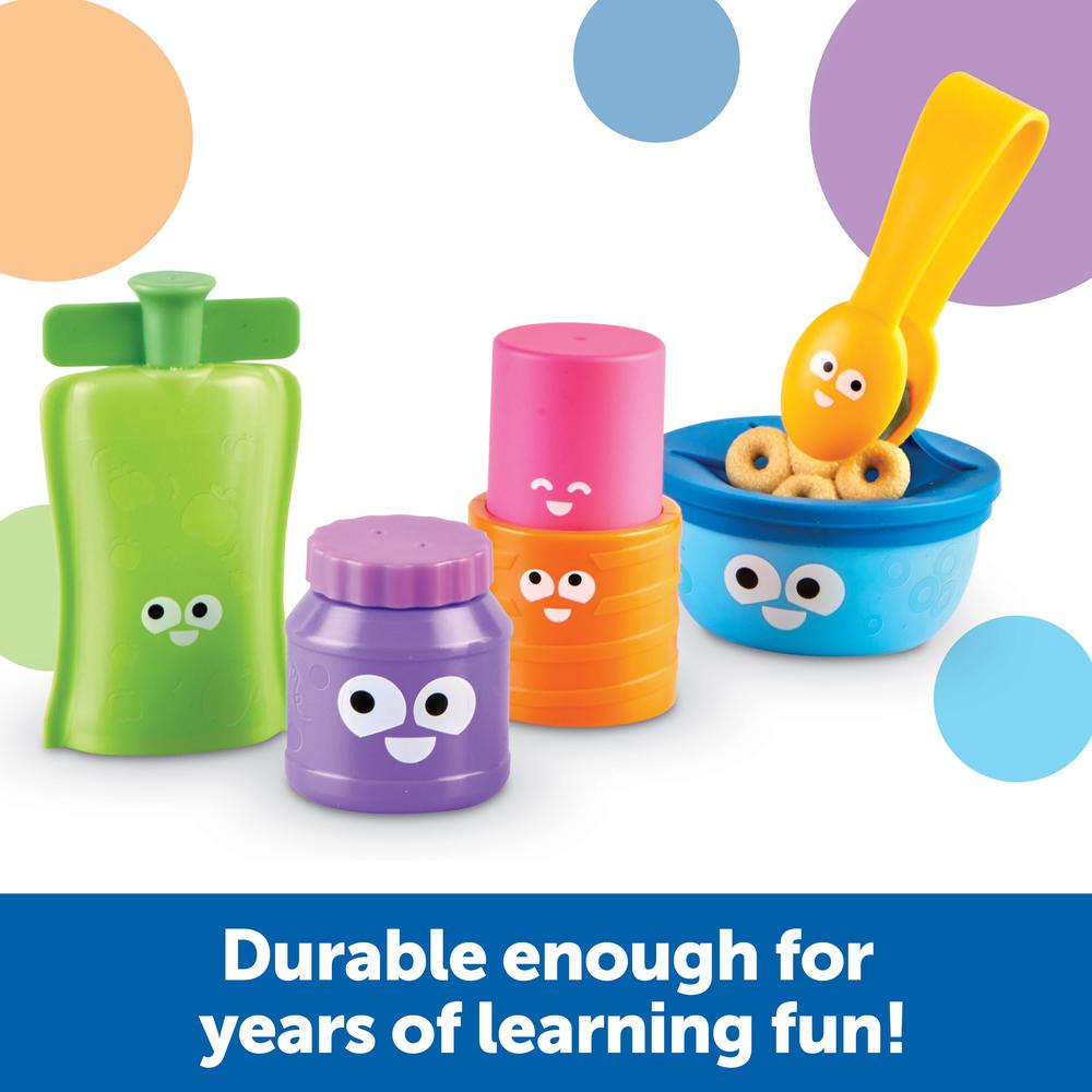 Your favorite snacks are ready for fine motor fun! This snack pals set helps kids develop multiple fine motor skills and movements at once: twisting the jar lid, pushing the pop, squeezing the pouch, and more!