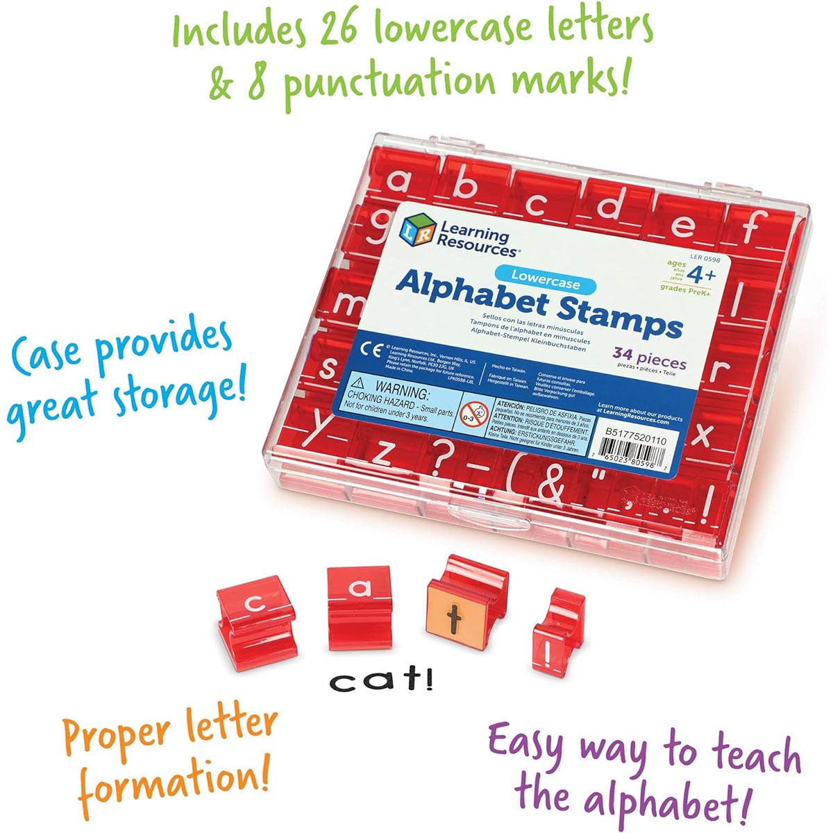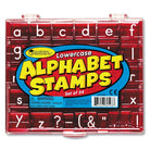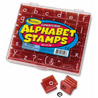 - The alphabet stamps contain 26 lowercase letters and eight punctuation stamps made of durable plastic and rubber.