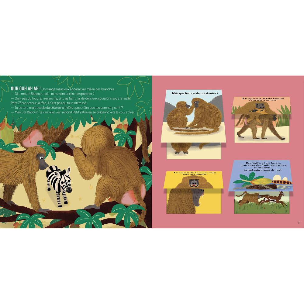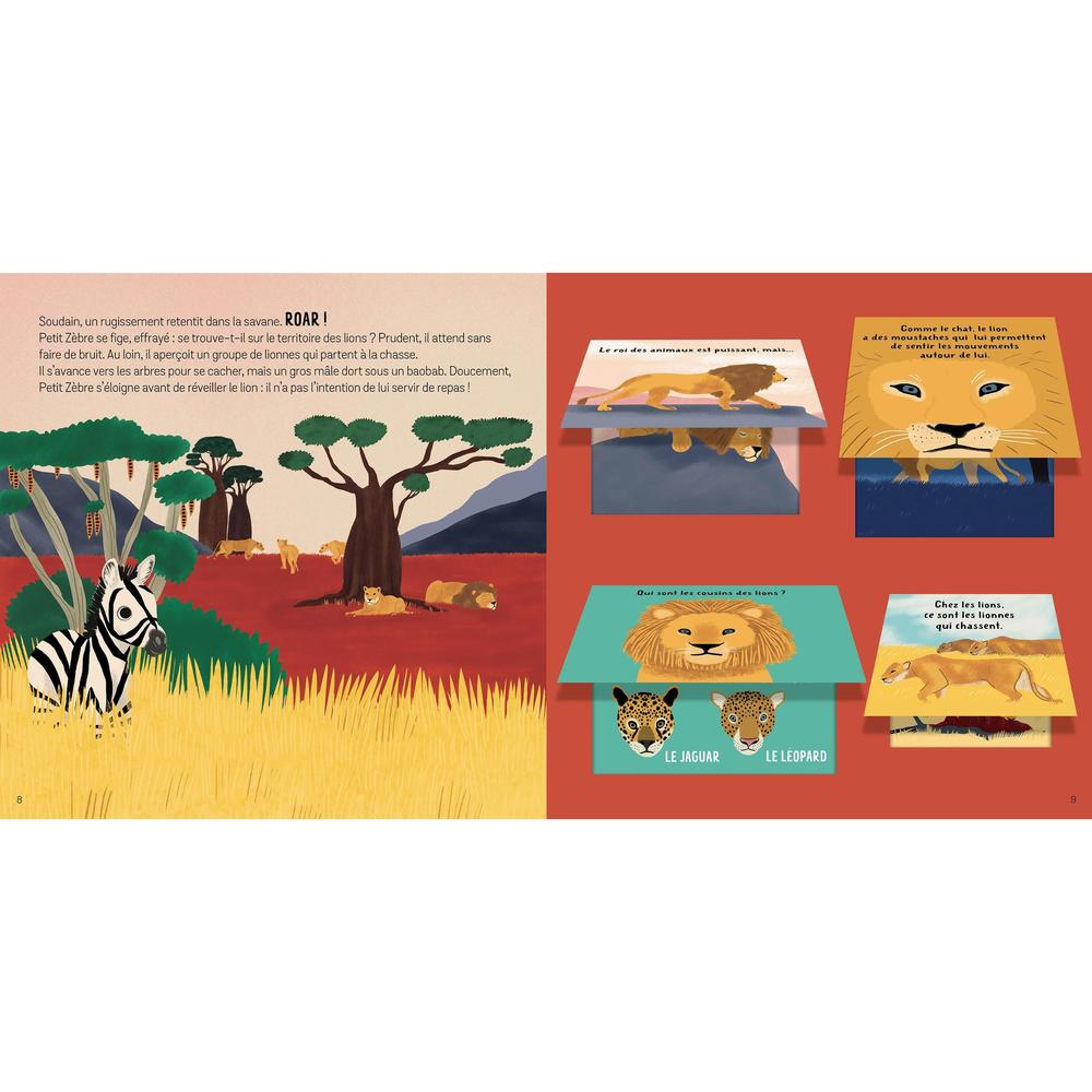The story of Little Zebra, which unfolds on the left-hand pages, will capture the child's attention by immersing them in the world of savannah animals. The factual information, hidden under the flaps on the right-hand pages, will allow them to learn many things about the animals they have met in the story.