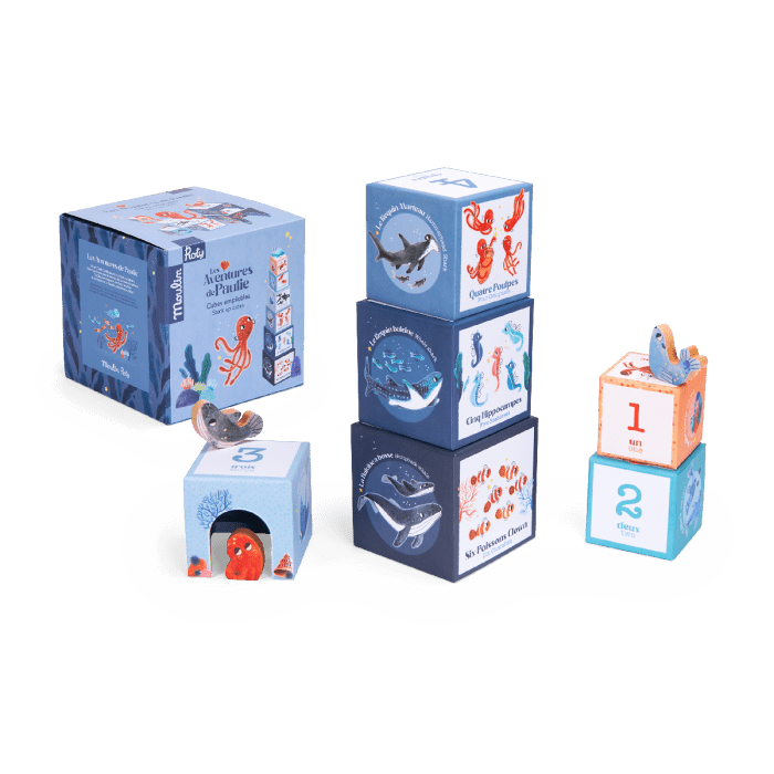 Invite your baby to dive into the ocean with this set of 6 stacking cubes and 3 wooden characters. Each cube is designed to spark curiosity and encourage exploration from 12 months. Your child can easily manipulate the cubes to create an impressive tower or have fun counting.