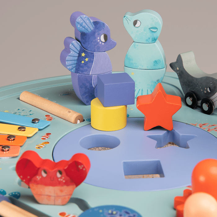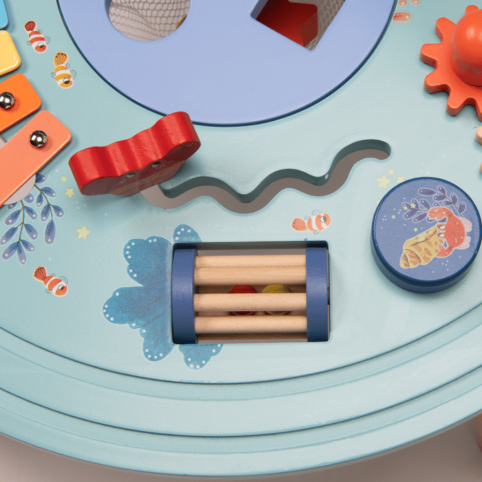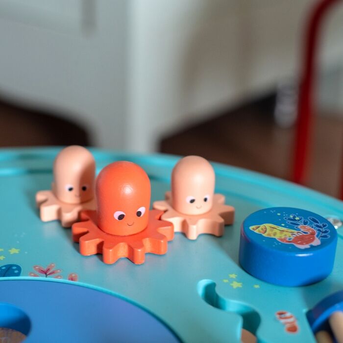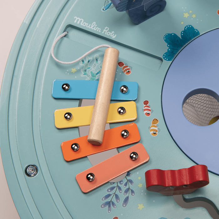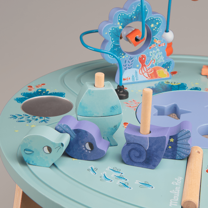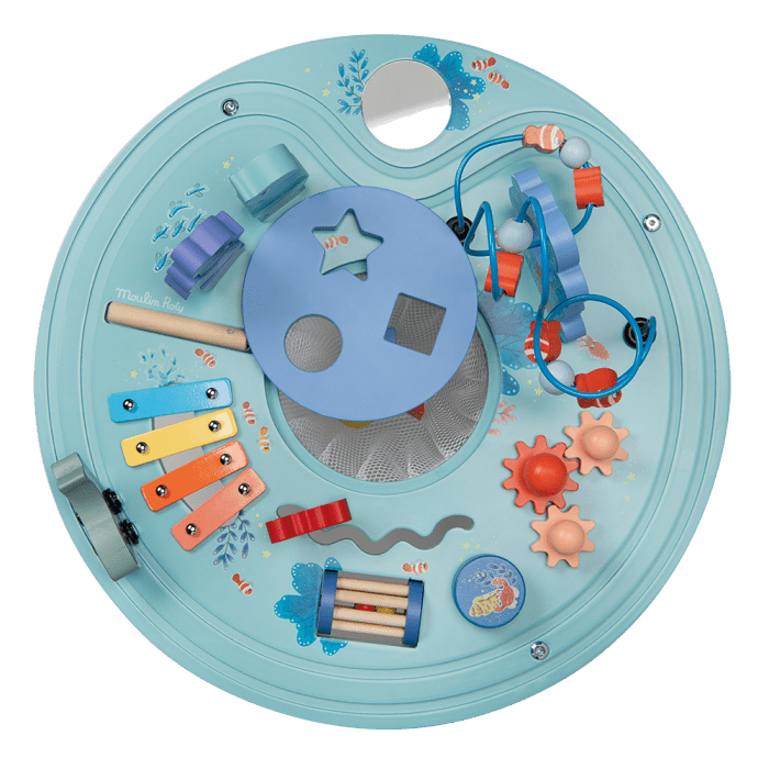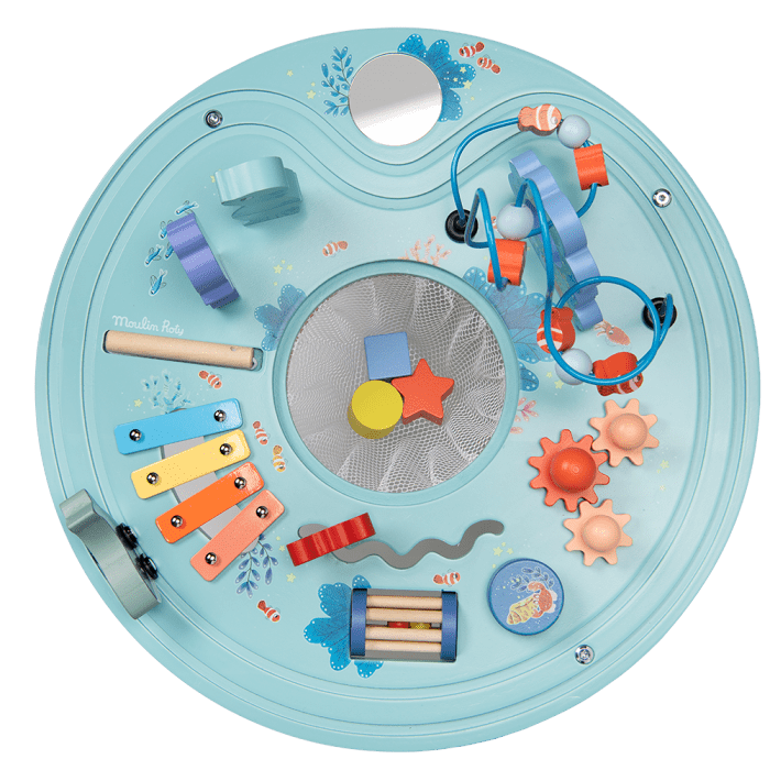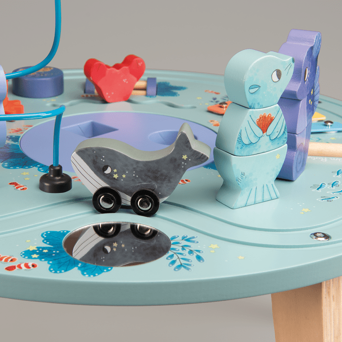 Looping with the clownfish, circuit with the whale, zig-zag with the crab, many surprises await baby on this pretty colorful activity table... there are even little octopuses to spin, a sea lion and a seahorse.